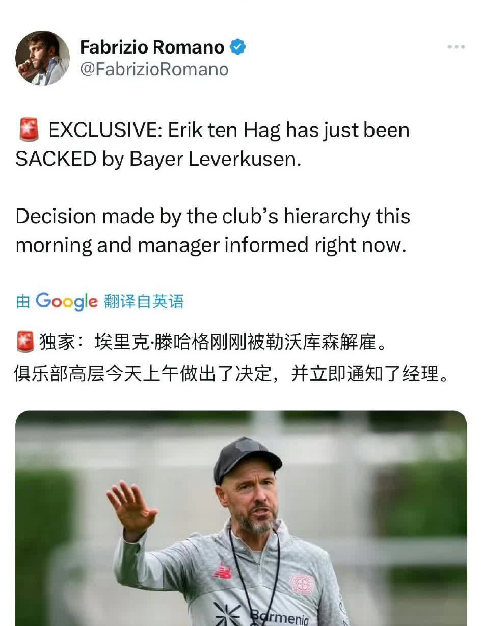 滕哈赫被解雇下课,请曼联好好学学! 这不禁让人回想起当初在曼彻斯特滕哈赫与C罗之间的矛盾,滕光头为了树立自己在俱乐部的威严,不顾C罗在球队中的作用和地位,无所不用其极地打压总裁,以至于C罗与曼联最终闹得不欢而散 如今看看勒沃库森,新赛季才踢三场就果断解雇新任命的主教练,再次证明曼联当时看走了眼!