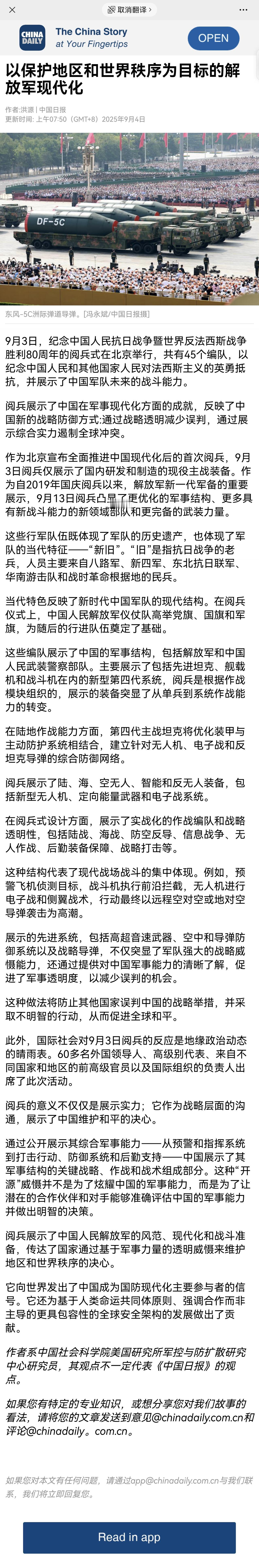 2025年9月4日在中国日报发表了评述9.3大阅兵文章:《中国人民解放军现代化旨在维护地区和世界秩序》'Modernization of PLA aimed at protecting regional, world order'. 中文为机器翻译。 九三阅兵 九三胜利日大阅兵