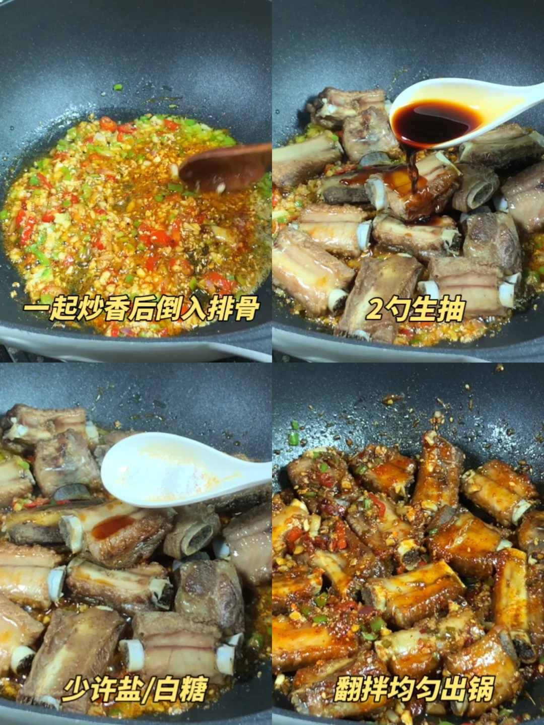 3️⃣锅内留油倒入小米辣,青尖椒粒,蒜末,样葱粒翻炒出香味,再放入辣椒粉,孜然粒,椒盐,白芝麻翻炒一会儿,倒入排骨,加2勺生抽,少许盐和白糖调味,翻拌均匀入味即可