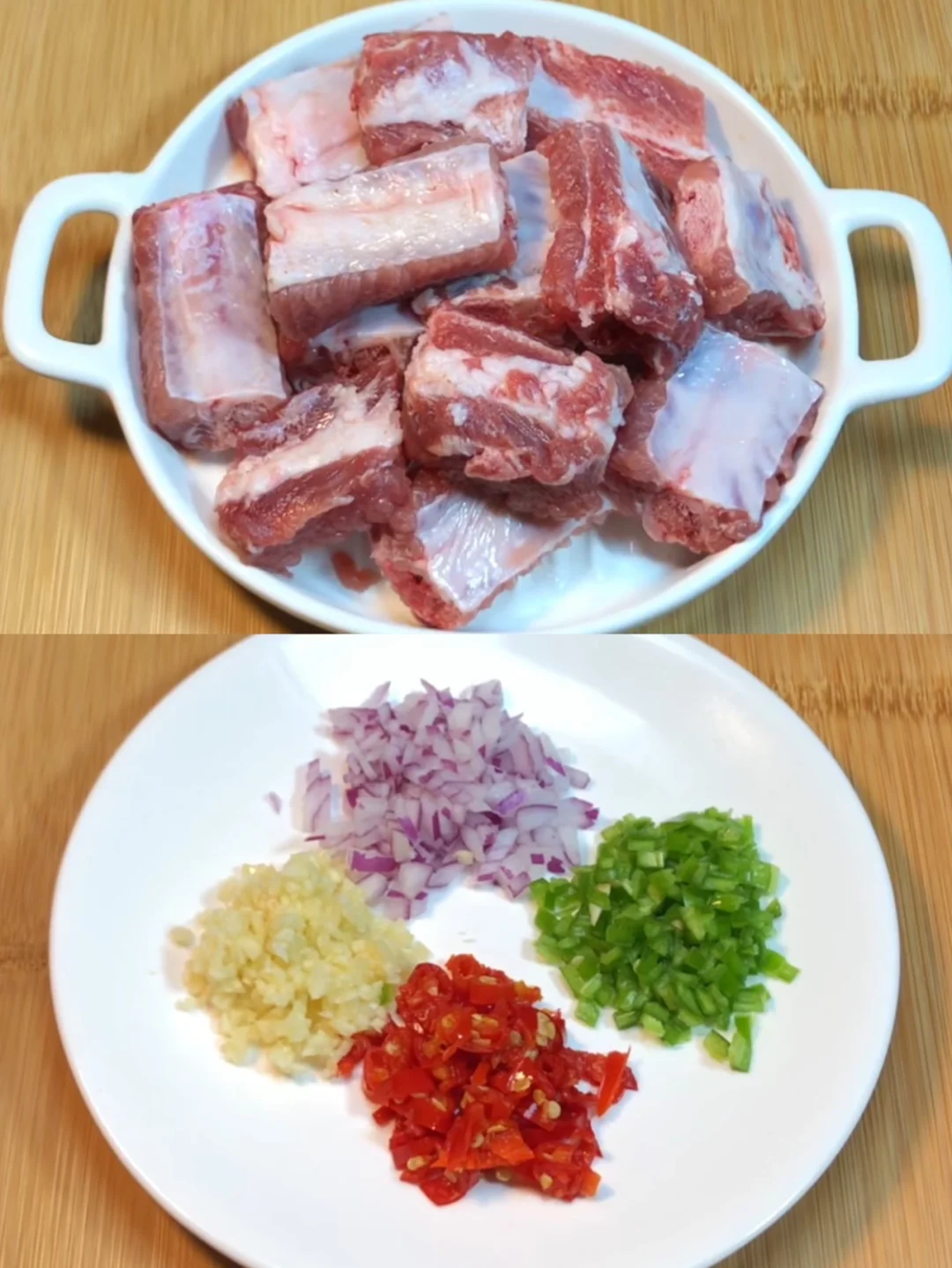 🍀🍀加工食材:猪肋排洗净,青尖椒,小米辣洋葱,蒜瓣各切成小丁备用