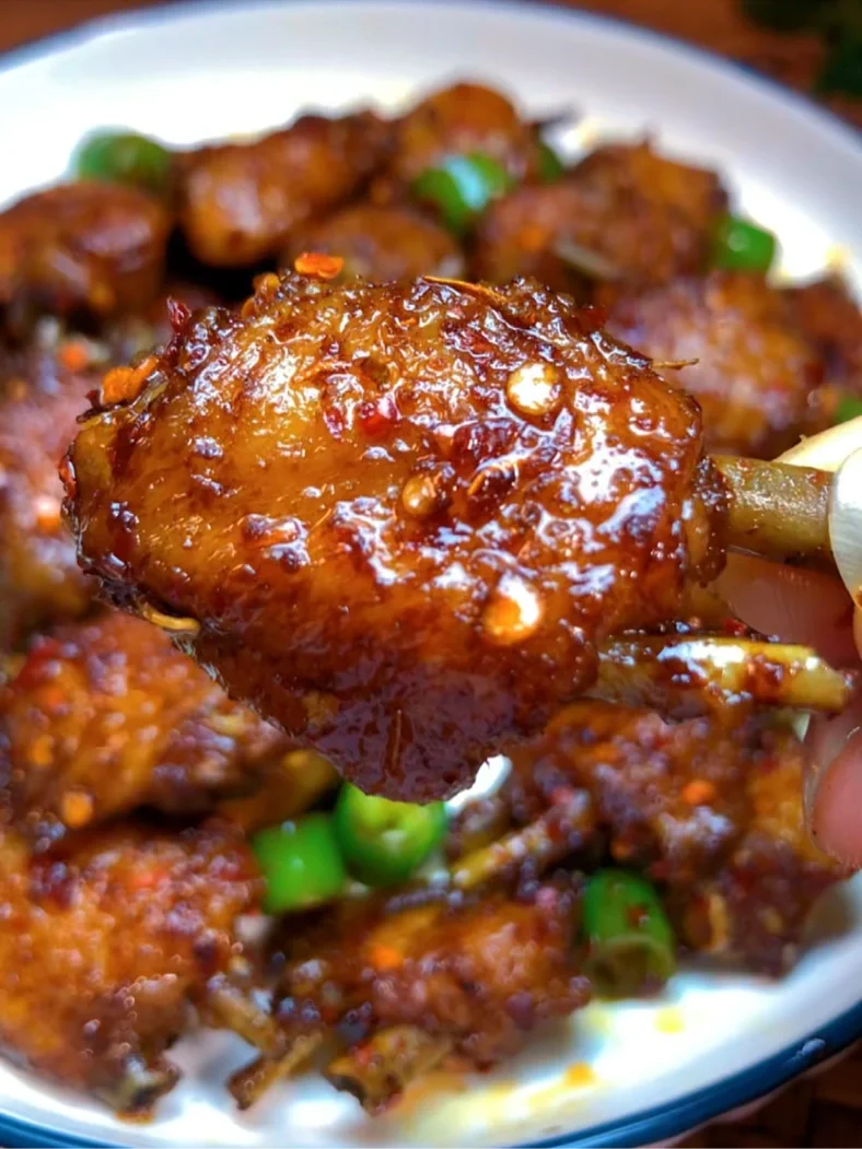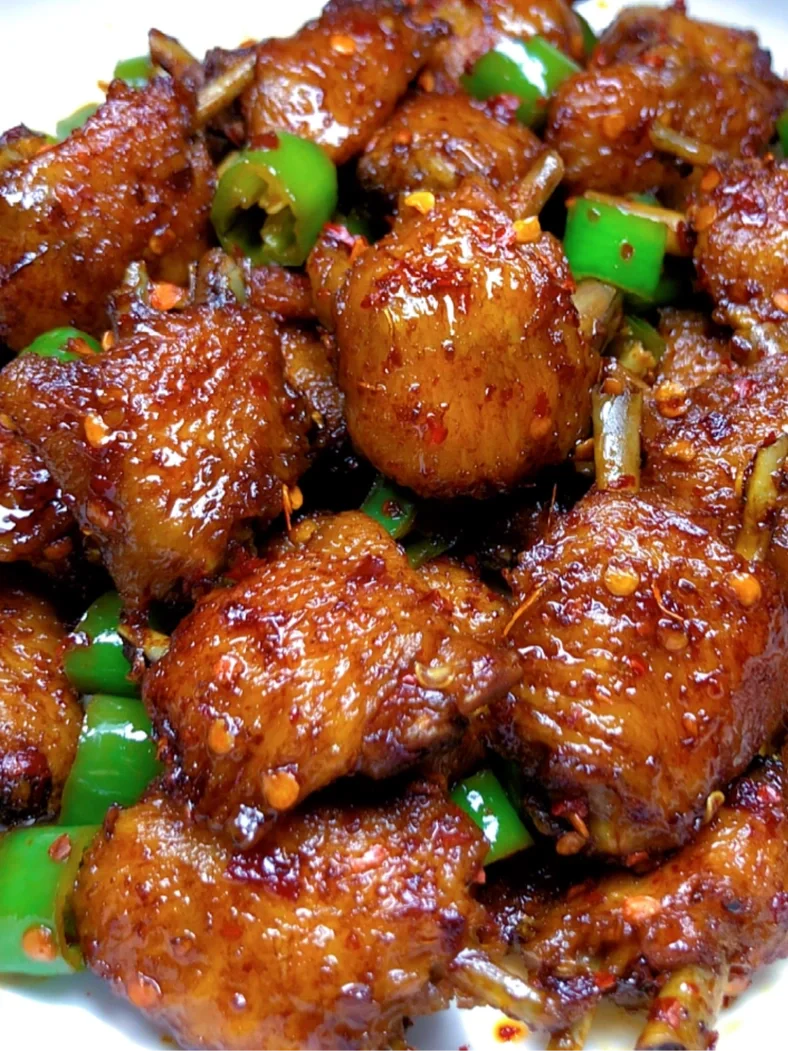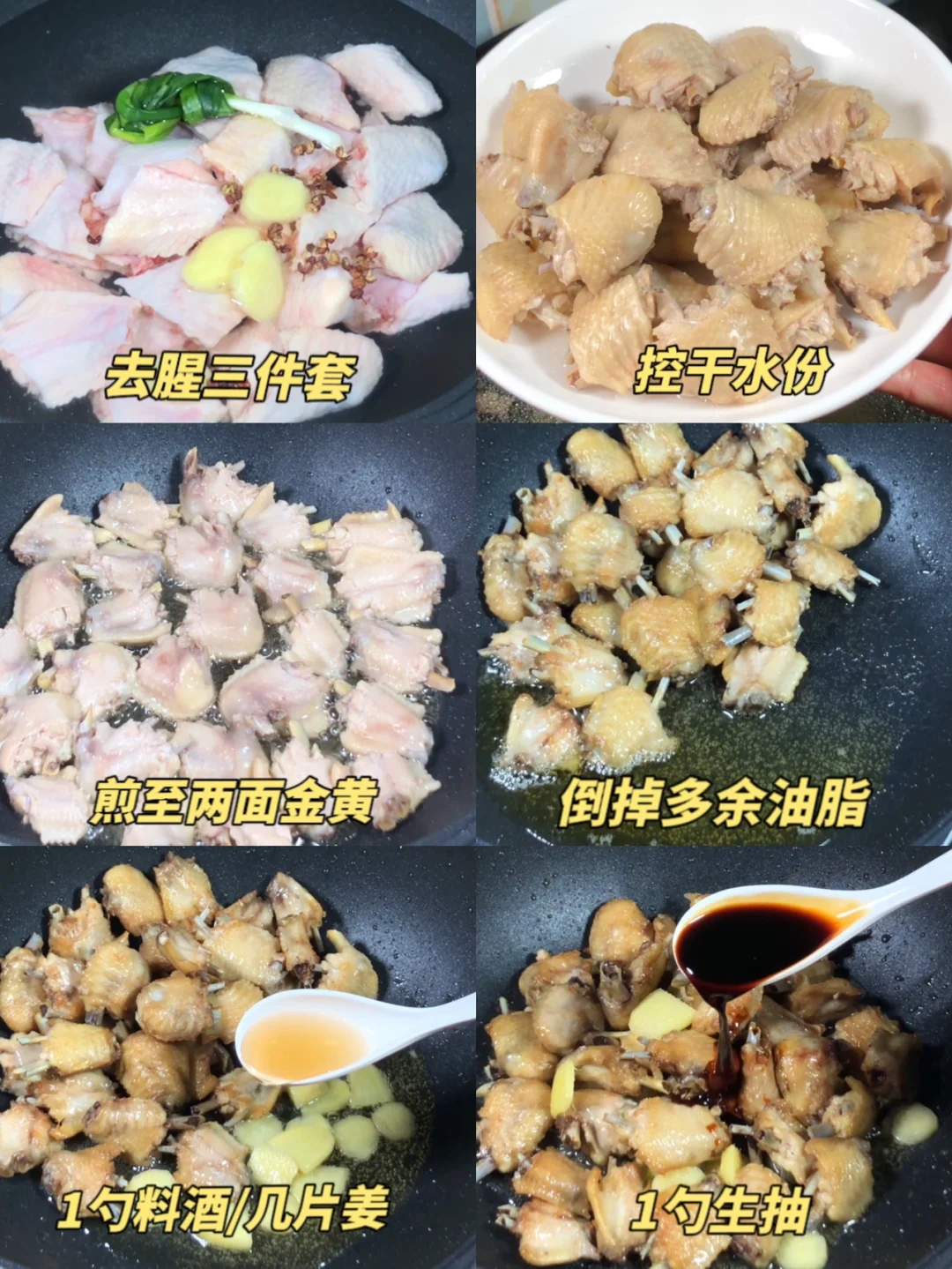 🌿🌿做法:1️⃣鸡翅对半切开,冷水下锅,(去腥三件套)葱姜,红花椒粒,焯水后控干水分备用2️⃣锅里热油,下鸡翅中小火煎至两面金黄,倒掉多余油脂,放几片姜➕1勺料酒➕2勺生抽➕半勺老抽➕半勺蚝油➕适量辣椒粉➕线椒粒翻炒均匀上色