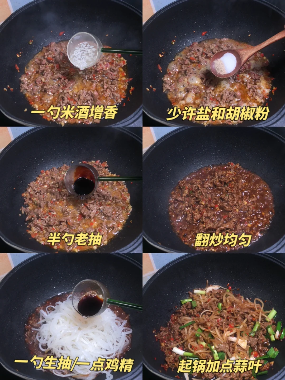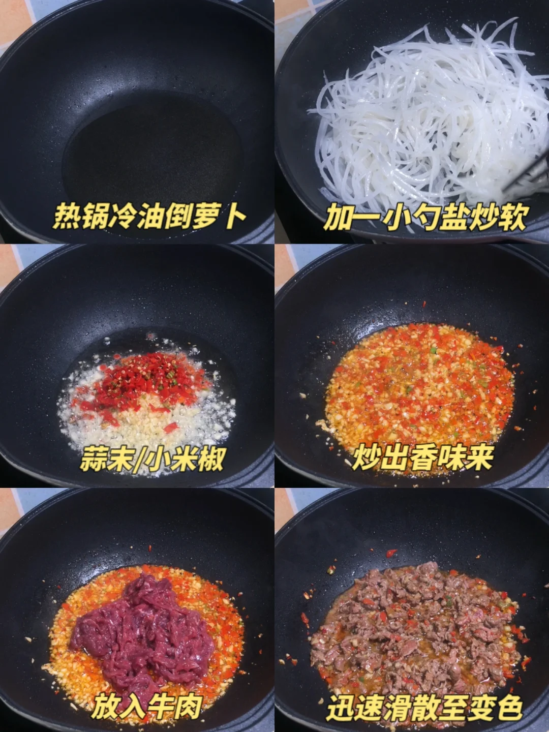 2️⃣另起锅倒油,蒜末和小米椒炒香,放牛肉,迅速炒变色后加一勺米酒去腥增香,调味加少许盐和胡椒粉,半勺老抽翻炒均匀上色,放萝卜丝,一点生抽和鸡精炒匀,起锅前放点大蒜翻炒个30秒即可