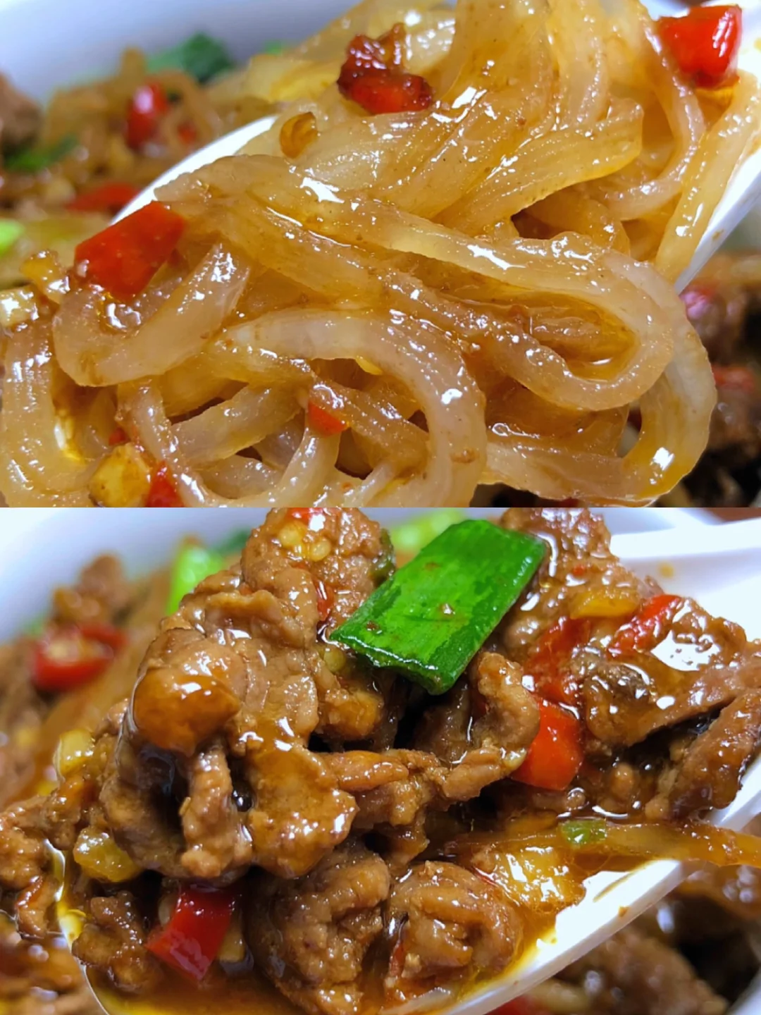 🌿🌿做法:1️⃣萝卜去皮切细丝,牛肉切薄片备用,起锅倒油,白萝卜丝放少许盐炒软盛出