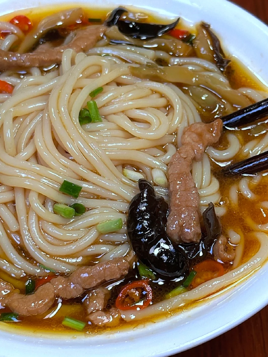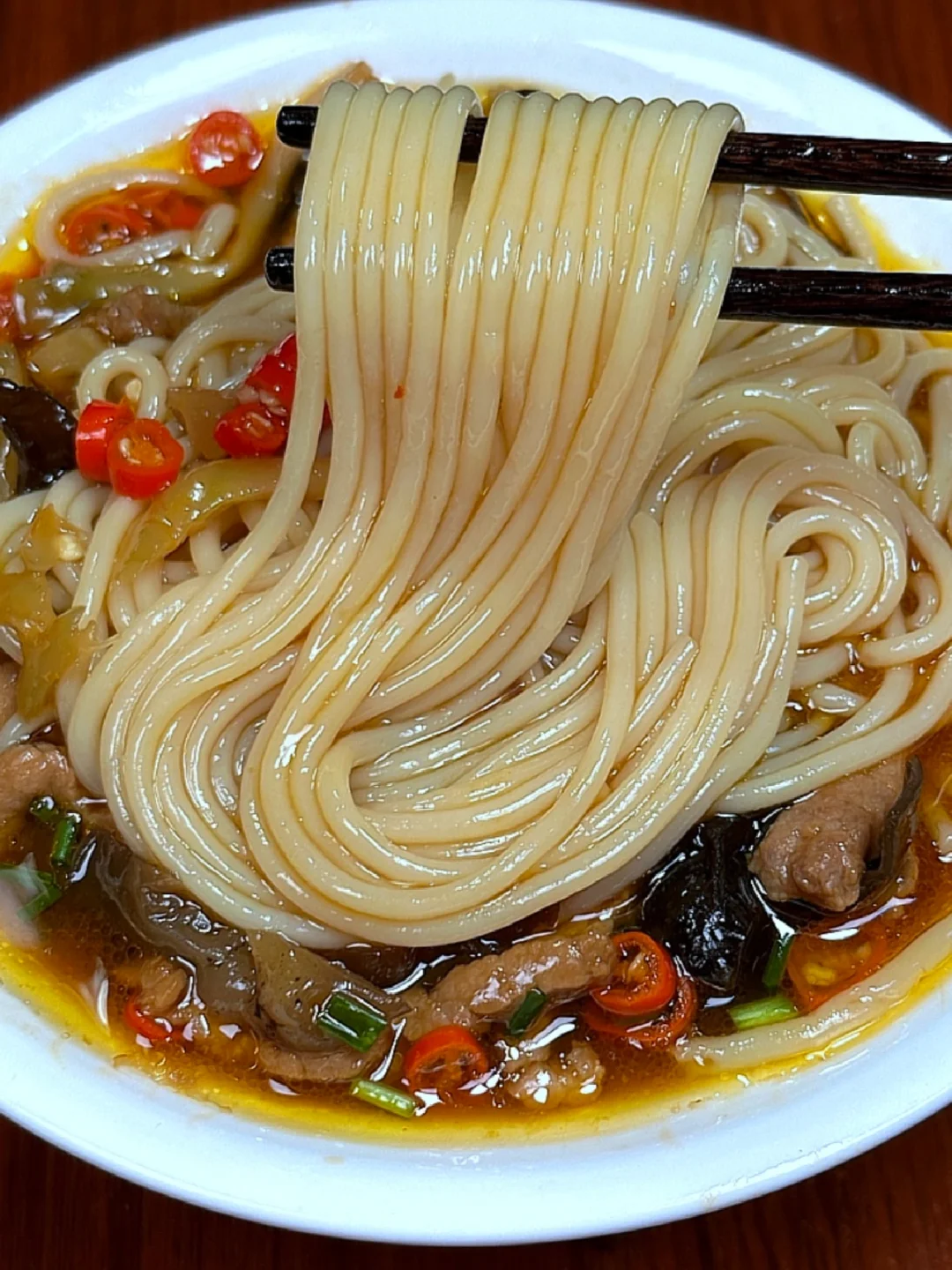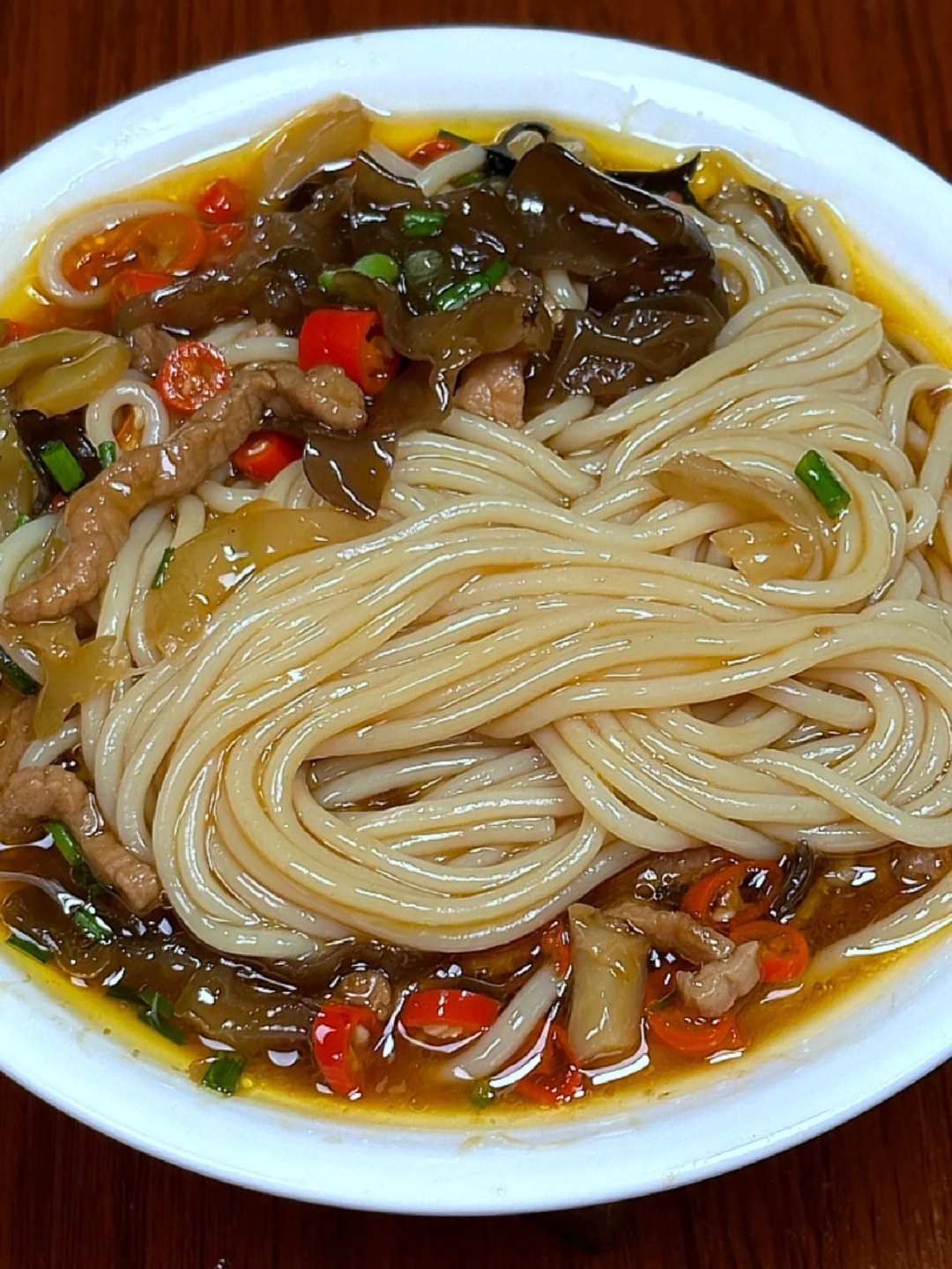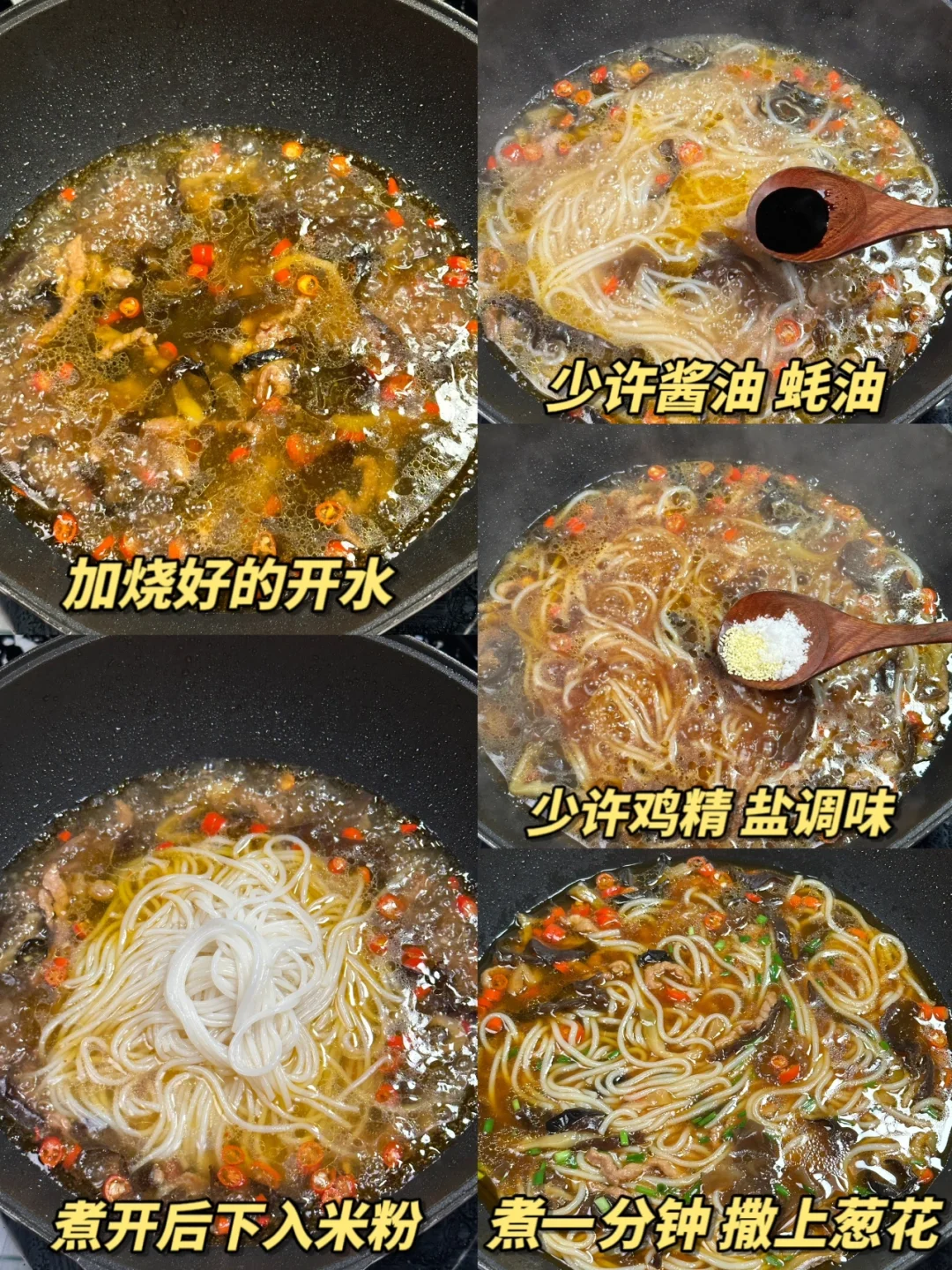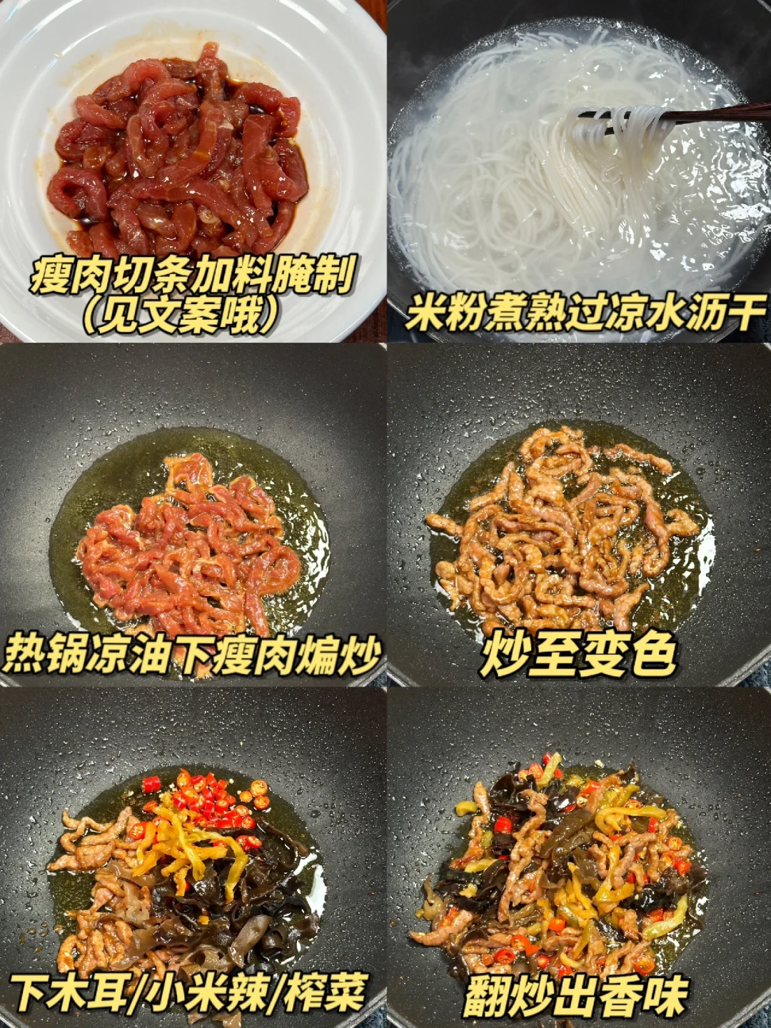 2️⃣热锅凉油下瘦肉炒至变色,加木耳,榨菜,下米椒炒出香味,倒入适量的开水,加水煮开后下米粉,配菜和米粉混合均匀,加酱油,蚝油,盐,鸡精调味,煮个一分钟左右,出锅加葱花即可