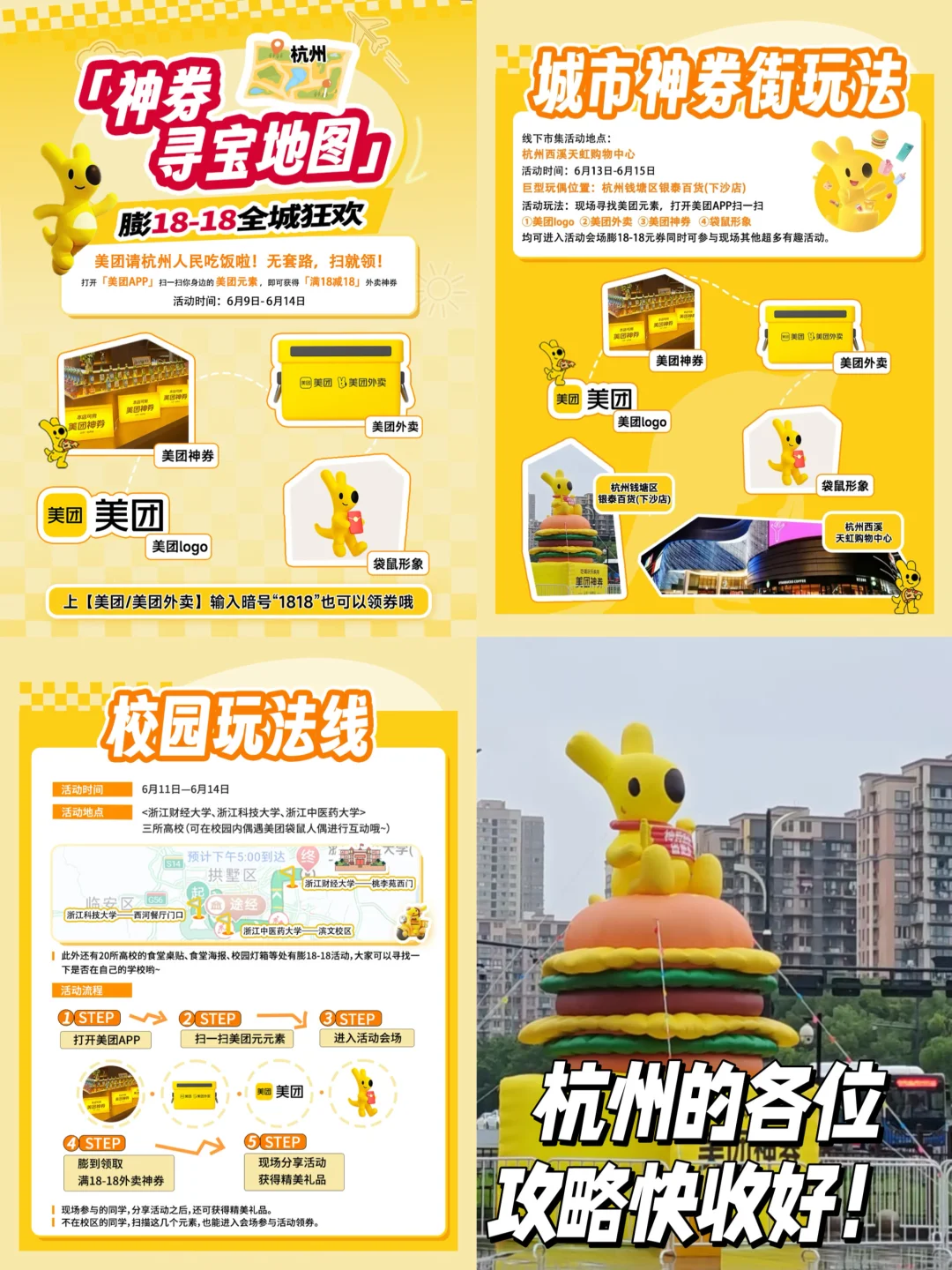 美团的logo、美团外卖的logo、美团袋鼠的图案、带有美团神券的灯箱、美团神券的logo……