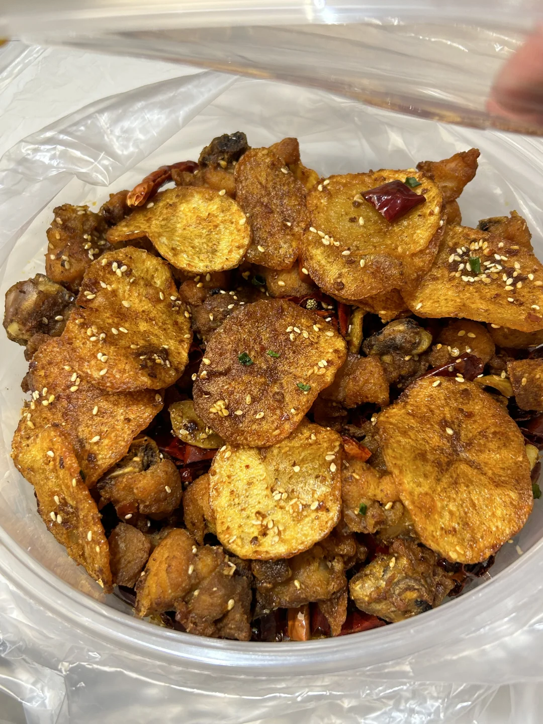 薯片热呼呼的脆脆的jujuju好吃啊!!鸡肉也很嫩,一口惊艳嘎嘎炫!!