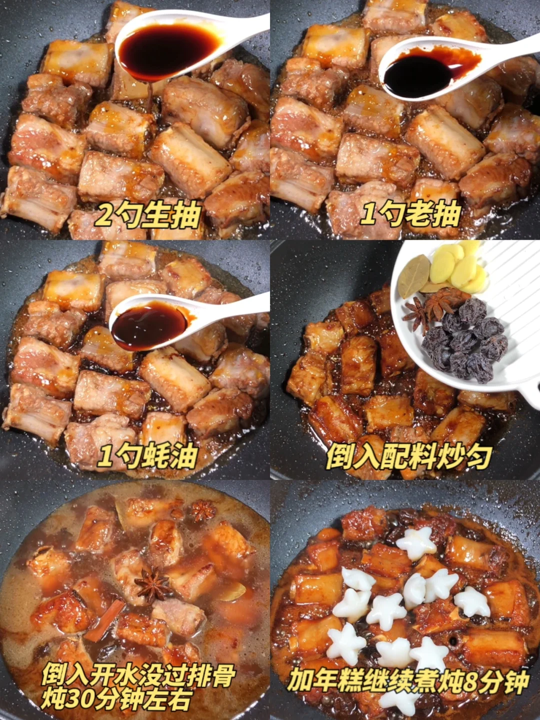 3️⃣2勺生抽➕1勺老抽➕1勺蚝油➕倒入配料翻炒均匀,倒入提前烧好的开水末过排骨,盖上锅盖中小火炖25分钟,开盖后加入年糕继续炖8分钟,最后收汁至浓稠