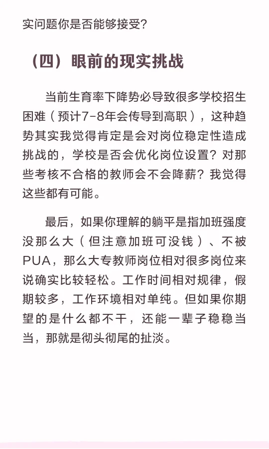 大专教师工作强度大,需承担繁重的教学、科研、行政任务,晋升职称和完成考核指标压力大,且面临招生困难和岗位优化风险。工作时间规律但假期多,躺平并非轻松选择。