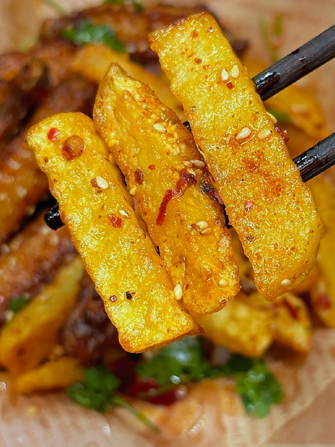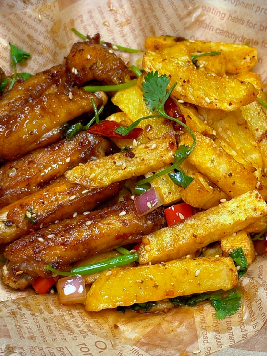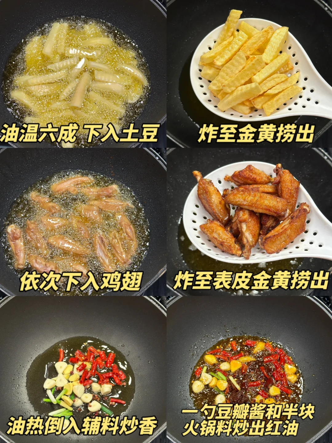 2️⃣锅中倒入宽油,油温六成,下入土豆条,炸至表面金黄捞出,接着下入鸡翅,炸至表面金黄色捞出