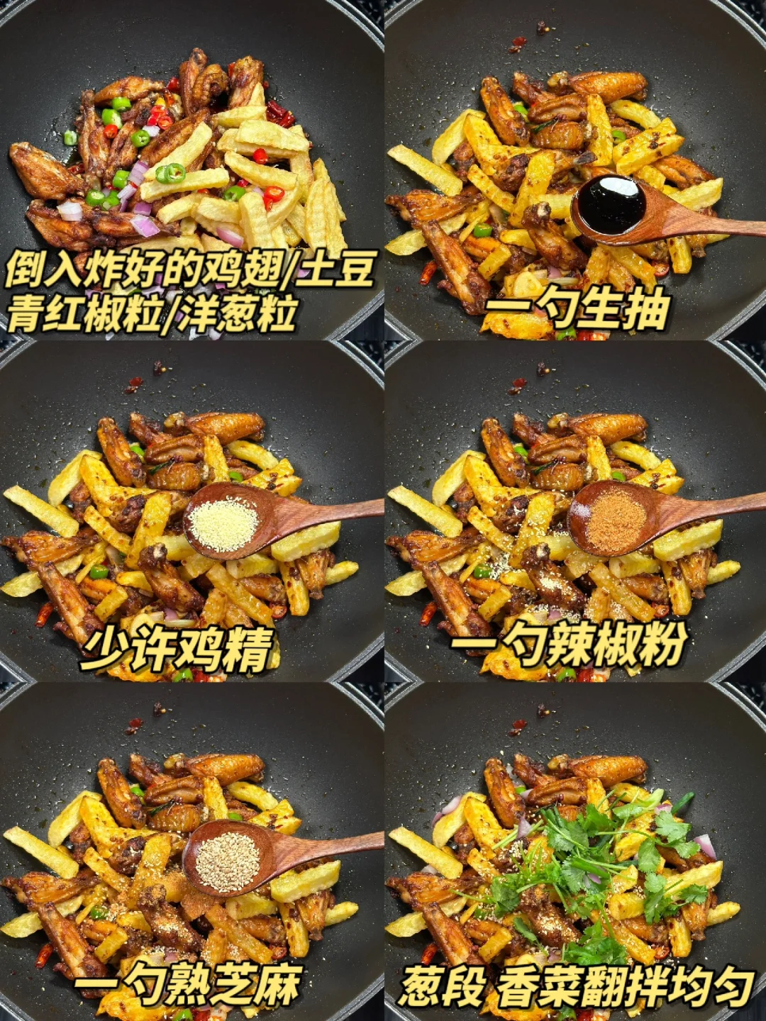 3️⃣锅中留少许底油,油热倒入葱姜蒜,干辣椒段炒香,加一勺豆瓣酱和半块火锅料炒出红油,倒入炸好的鸡翅、土豆、洋葱粒、青红椒粒,加一勺生抽➕少许鸡精➕一勺辣椒粉(不能吃辣的可以不放)撒些熟芝麻,葱和香菜段,翻拌均匀即可