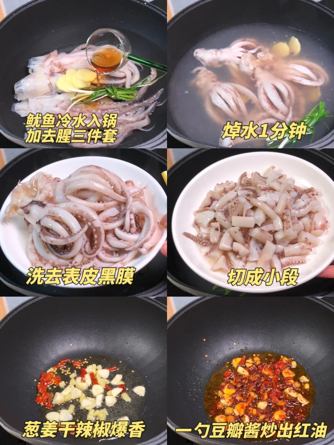 🍀🍀做法:1️⃣洗干净的鱿鱼冷水入锅,加去腥三件套(葱 姜 料酒)水开后焯水30秒即可捞出,用清水洗去表面的黑膜,再切成小段