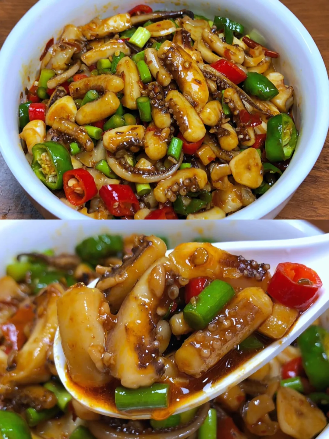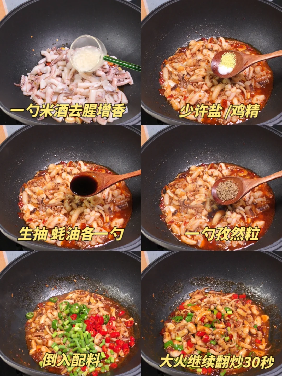 2️⃣热锅起油,葱姜爆香,加一勺豆瓣酱炒出红油,倒入切好了鱿鱼须,加一勺米酒去腥增鲜,加少许盐和鸡精➕1勺生抽➕1勺蚝油➕1勺孜然粒继续翻炒入味,最后加青红辣椒粒,蒜苔粒大火继续翻炒30秒即可