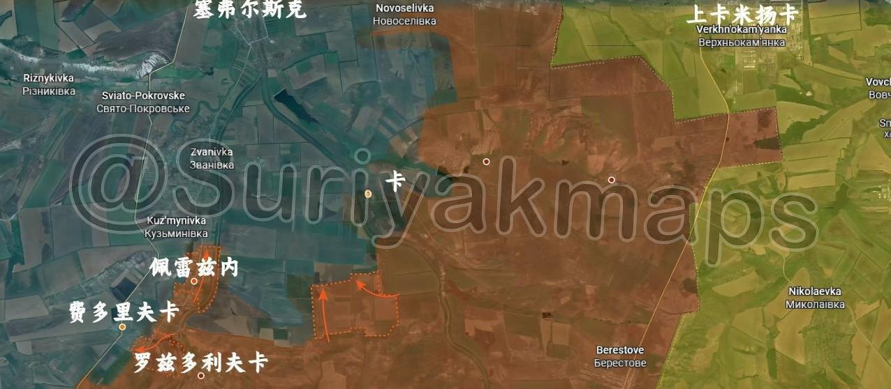 #俄乌局势新进展#suriyak更新9.2俄乌局势 1、库普扬斯克:俄军加强了该方向的作战,莫斯科夫卡方面局势没有变化,但城市西北郊各个村庄的控制情况尚不明朗。库普扬斯克体育场和中心广场周围的区域要么在俄罗斯控制之下,要么不在乌克兰控制范围内,变电站、面包厂和车库区域也是如此。城市中央的桥梁仍由乌克兰军队控制,而俄军已成功收复铁路以北地区。库普扬斯克东北的局势更加明朗,俄军已成功重回赫尼利恰河,包括库拉戈夫卡火车站(北纬49°44'59.9",东经37°39'37.2")。 2、塞弗尔斯克:俄军自2024年以来首次重启塞弗尔斯克以南地区的推进,并成功进入费多里夫卡并控制了佩雷兹内80%。此外,俄军还占领了维姆卡西南方向的一系列阵地。 3、顿河君士坦丁罗夫卡:俄罗斯军队占领大部分奥列克桑德罗舒尔泰内,正在对位于西部边缘的房屋进行梳理行动。 #俄乌战争#