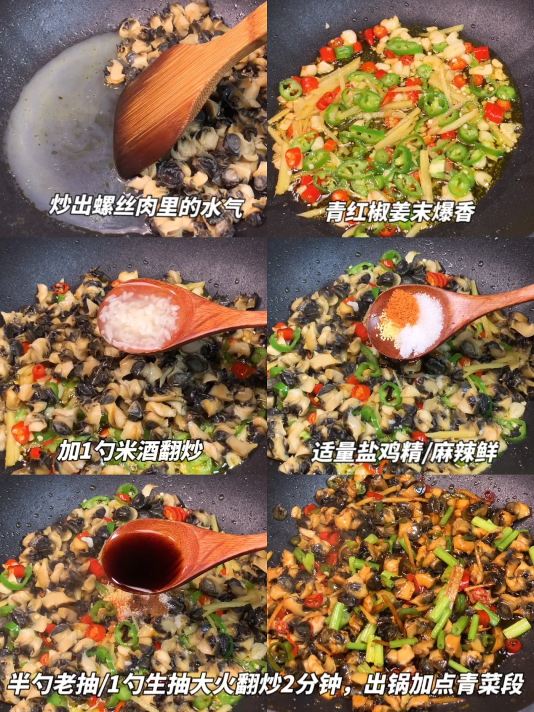 3️⃣另起锅放适量油,倒入青红辣椒,姜丝,蒜末一起爆香,倒螺丝肉,加1勺米酒(灵魂)翻炒均匀,加半勺老抽➕1勺生抽➕盐鸡精、麻辣鲜各适量,一起大火翻炒2分钟,出锅撒点青菜段就可以了,下酒又下饭,连辣椒都不剩~