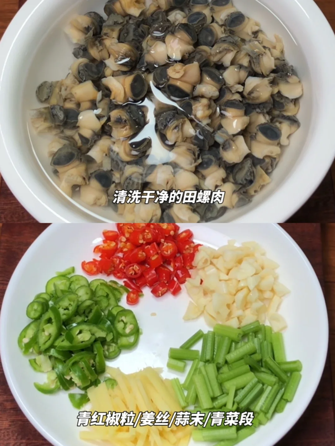 🌿🌿食材:田螺肉300g,青红椒,姜丝,蒜末,青菜段