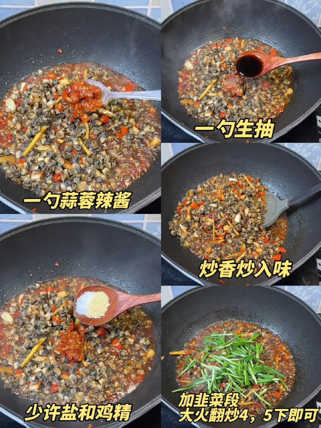 2️⃣锅中热油,小米椒,姜丝,蒜煸炒出香味,倒入螺丝肉,加一勺米酒,半勺老抽翻炒均匀,加一勺蒜蓉辣酱➕少许盐 鸡精➕一勺生抽,炒匀炒香,最后加韭菜大火翻炒4,5下即可