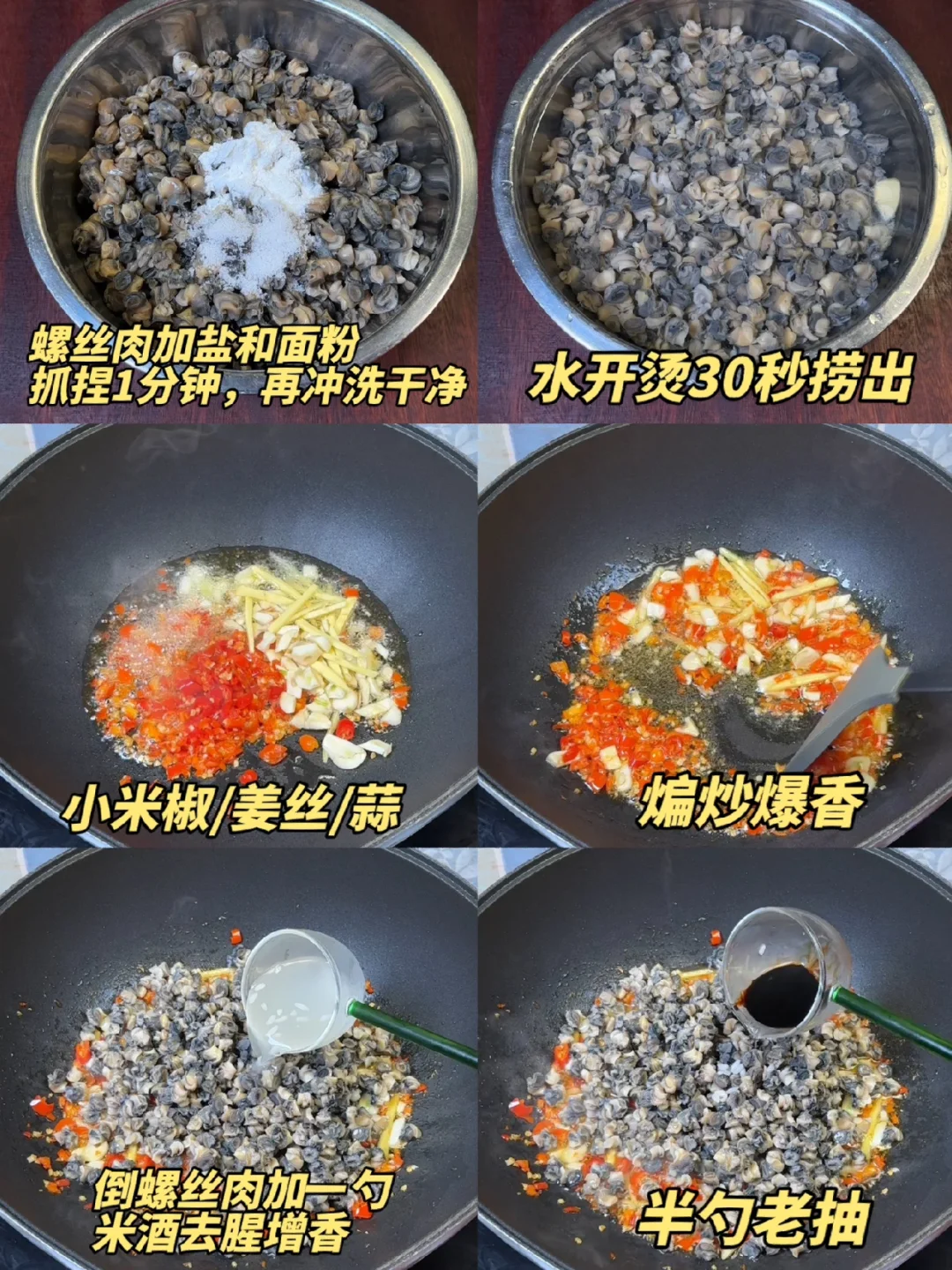 🌿🌿做法:1️⃣买的现成螺丝肉加盐和面粉,左手搓捏1分钟,去除里面的泥沙和土腥味,然后冲洗干净,锅中水开烫30秒捞出