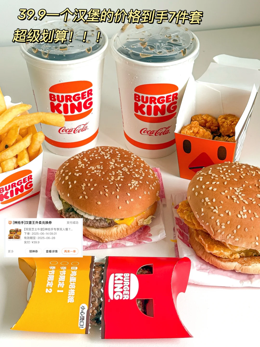 外卖我一般从美团App搜索🔍“神抢手”汉堡王7件套才39.9💰,之前一个汉堡的价格现在可以吃到7件套!!!一个双层芝士牛堡满满的蛋白质吃的超满足!!其他的让饭搭子来解决🍽️
