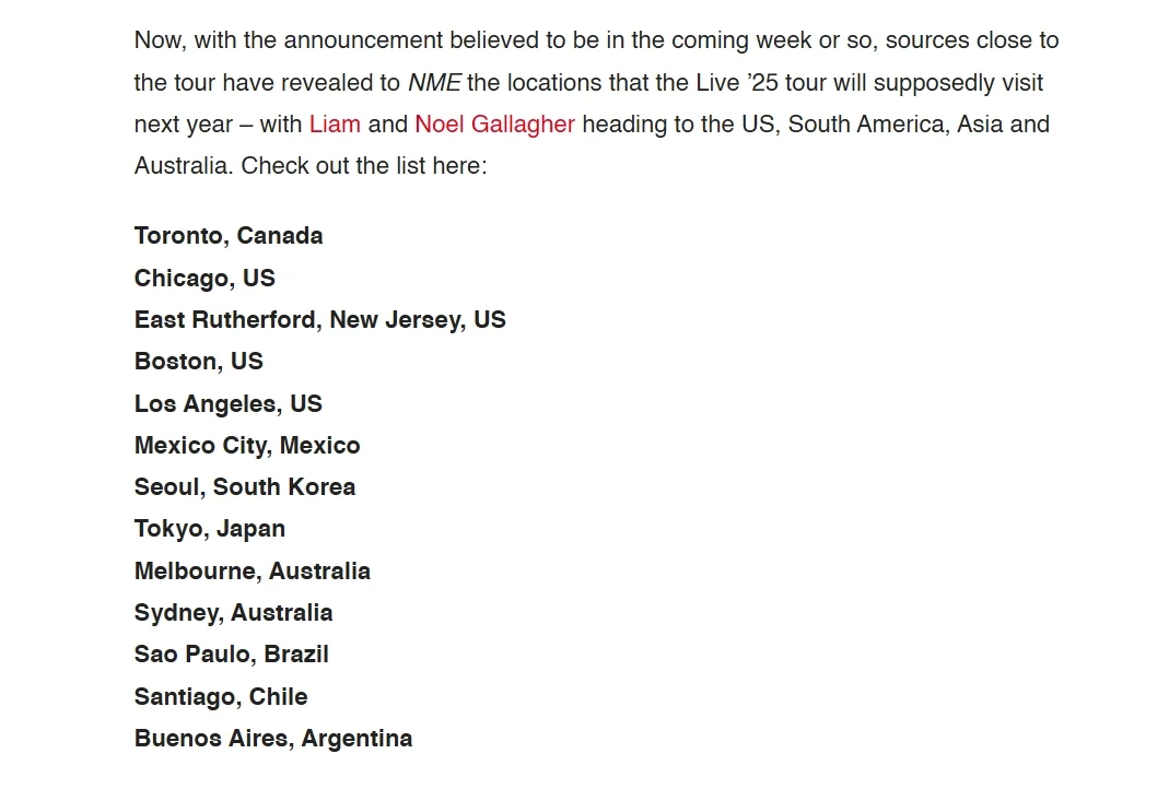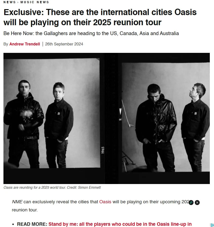 绿洲Oasis2025年重组巡演海外城市公布!