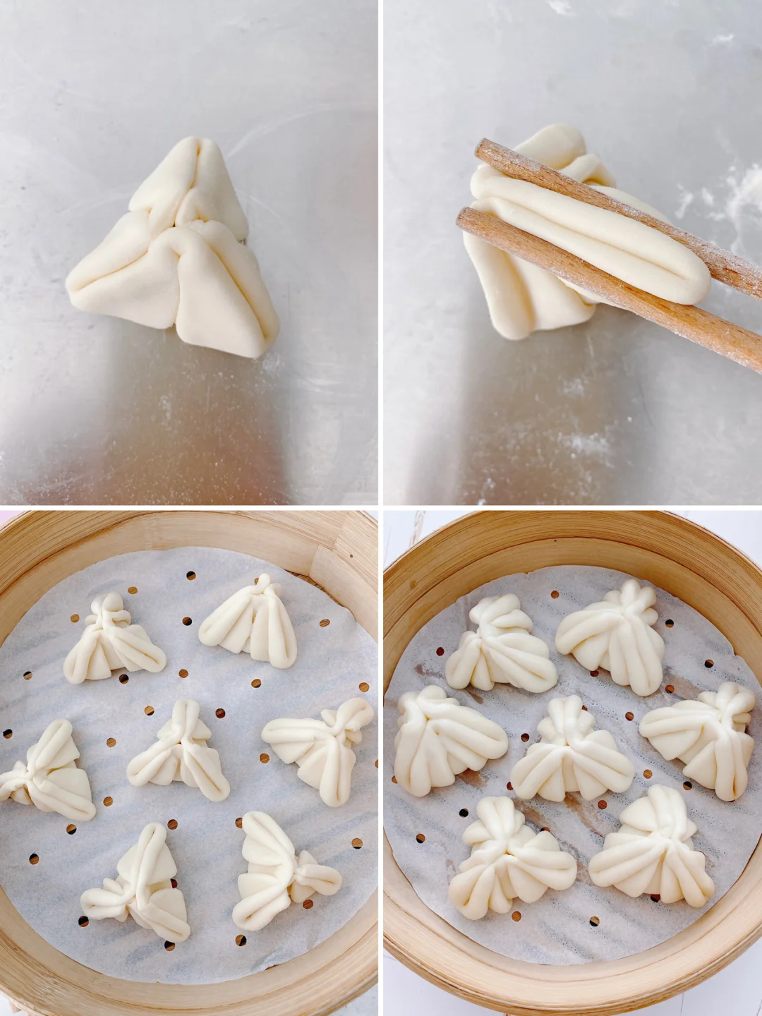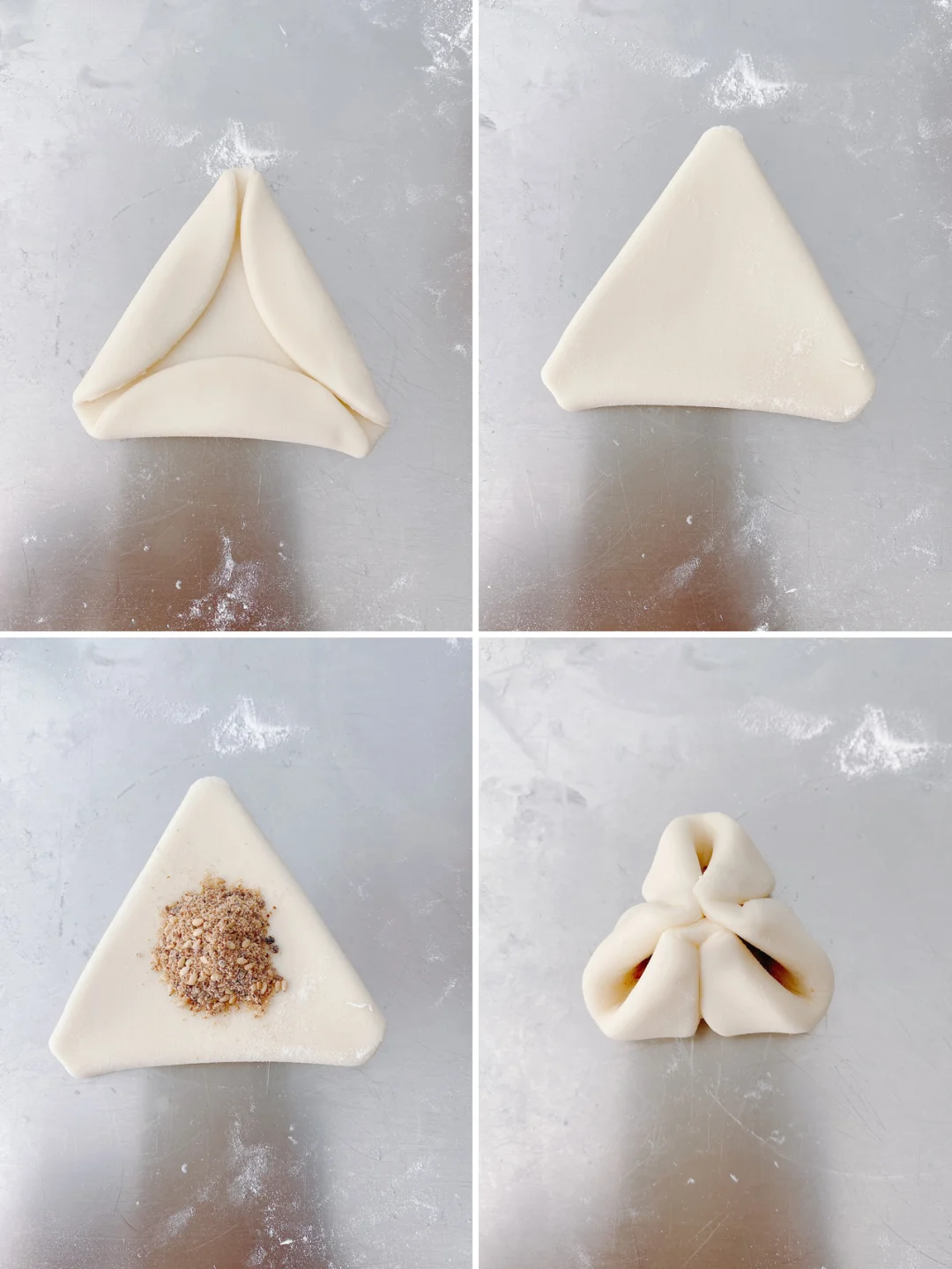 [色色R]非常喜欢吃糖三角,一口咬下去,甜甜的馅料,感觉敲幸福~~ 做法也很简单,一起来试试吧。 🌿准备食材: ➖面团:中筋面粉250克,温水125克,酵母2.5克,白糖20克 ➖馅料:红糖2勺,白芝麻1勺,面粉1勺 🌿步骤如下: 1️⃣先把馅料中的红糖,白芝麻,面粉混合均匀,红糖如果有结块要压碎(勺子是平时吃饭的那种) 2️⃣温水+酵母,用筷子搅匀,静置5分钟,加入面粉和白糖,搅拌成絮状,大致揉成面团(水温不能超过40度,以不烫手为宜) 3️⃣移到面板上操作,用搓衣服的手法,揉成一个光滑的面团(切开切面无毛孔) 4️⃣用擀面杖把面团擀平,用圆模具压出一个个圆形。(我用的是切饺子皮的工具,没有的也可以用圆杯子压,或者分成小剂子再擀平) 5️⃣将圆形折成三角形,翻到背面,放入适量馅料,把三个角提起,用手轻轻捏合,最后用筷子压紧。 6️⃣所有做好后放温暖处醒发至1.5倍大,轻按表面会慢慢回弹,或者拿起来感觉变轻就是发好了。发好后蒸15分钟,蒸好焖5分钟再打开。 在家做面食 | 宅家美食DIY|好吃的面食