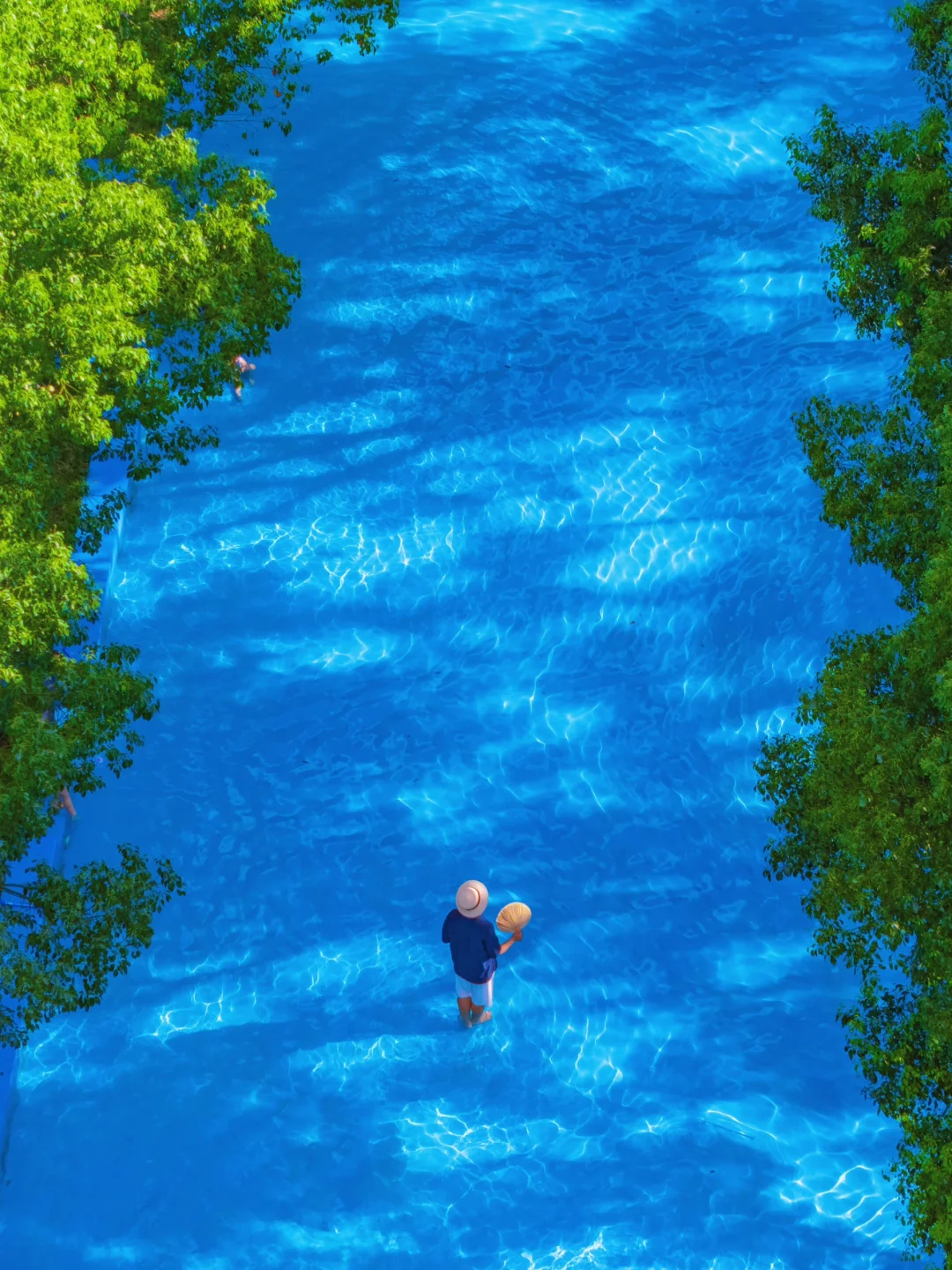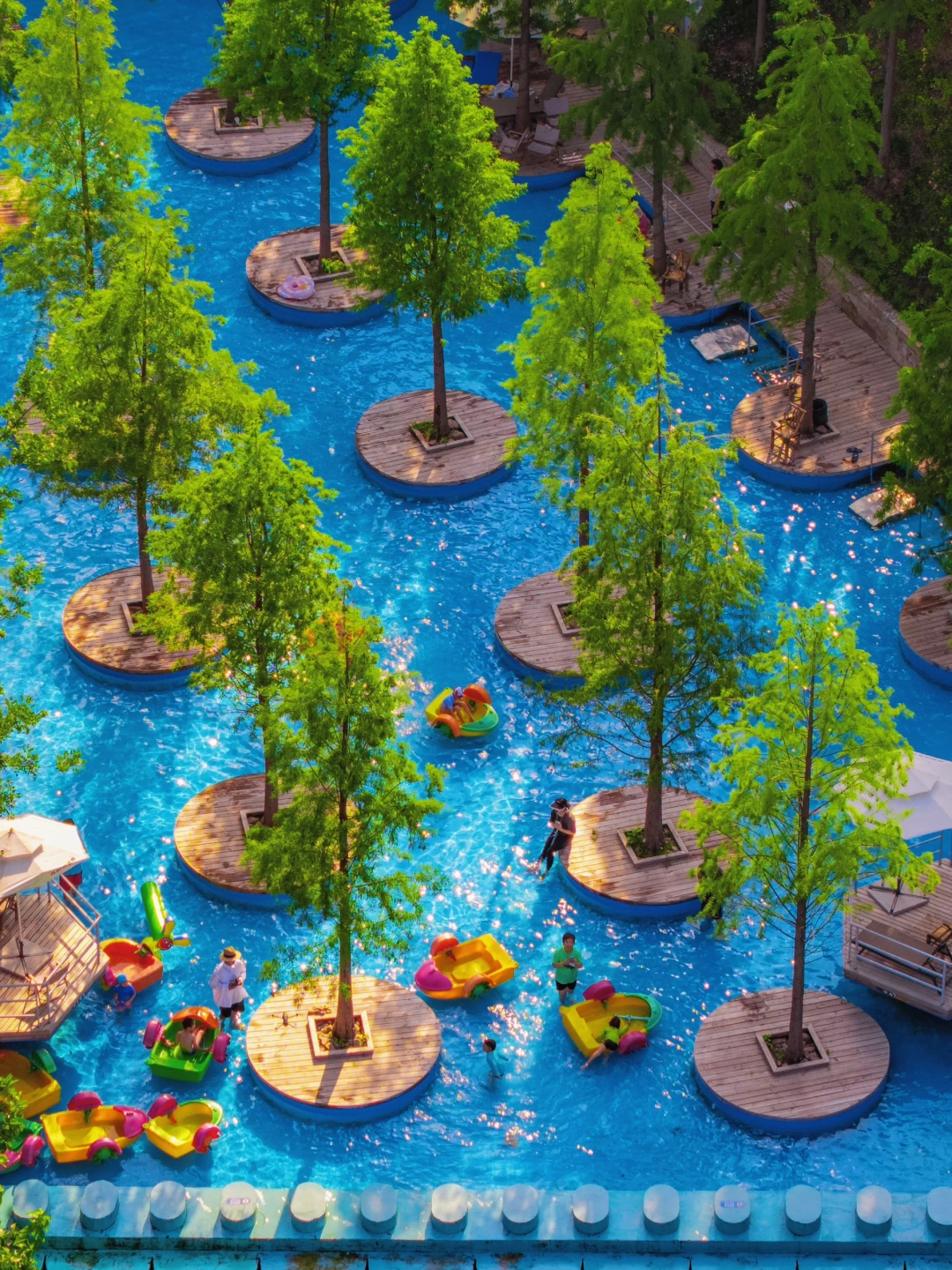 泳池上有很多树,宝爸宝妈可坐在树下看着娃儿玩水游泳,也有水上项目可玩~
