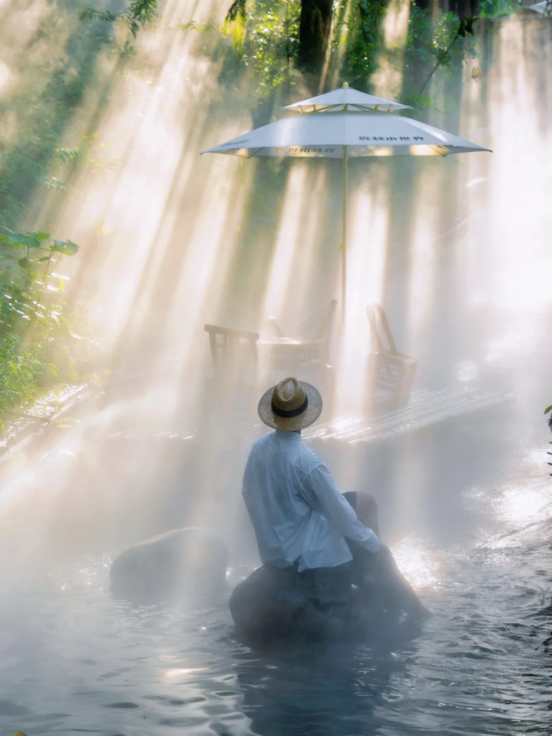 光脚踩进树荫下的溪流,坐着边聊边吃西瓜~当雾气弥漫在水池之中,居然能拍到了丁达尔效应,这一刻我感受到了光的具象化~