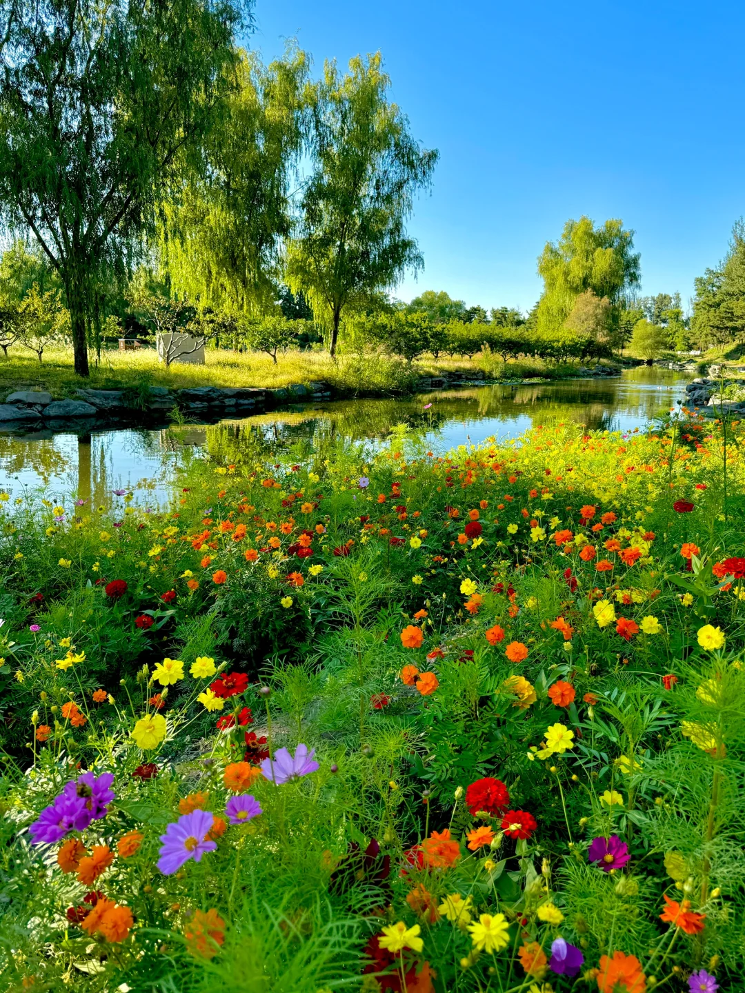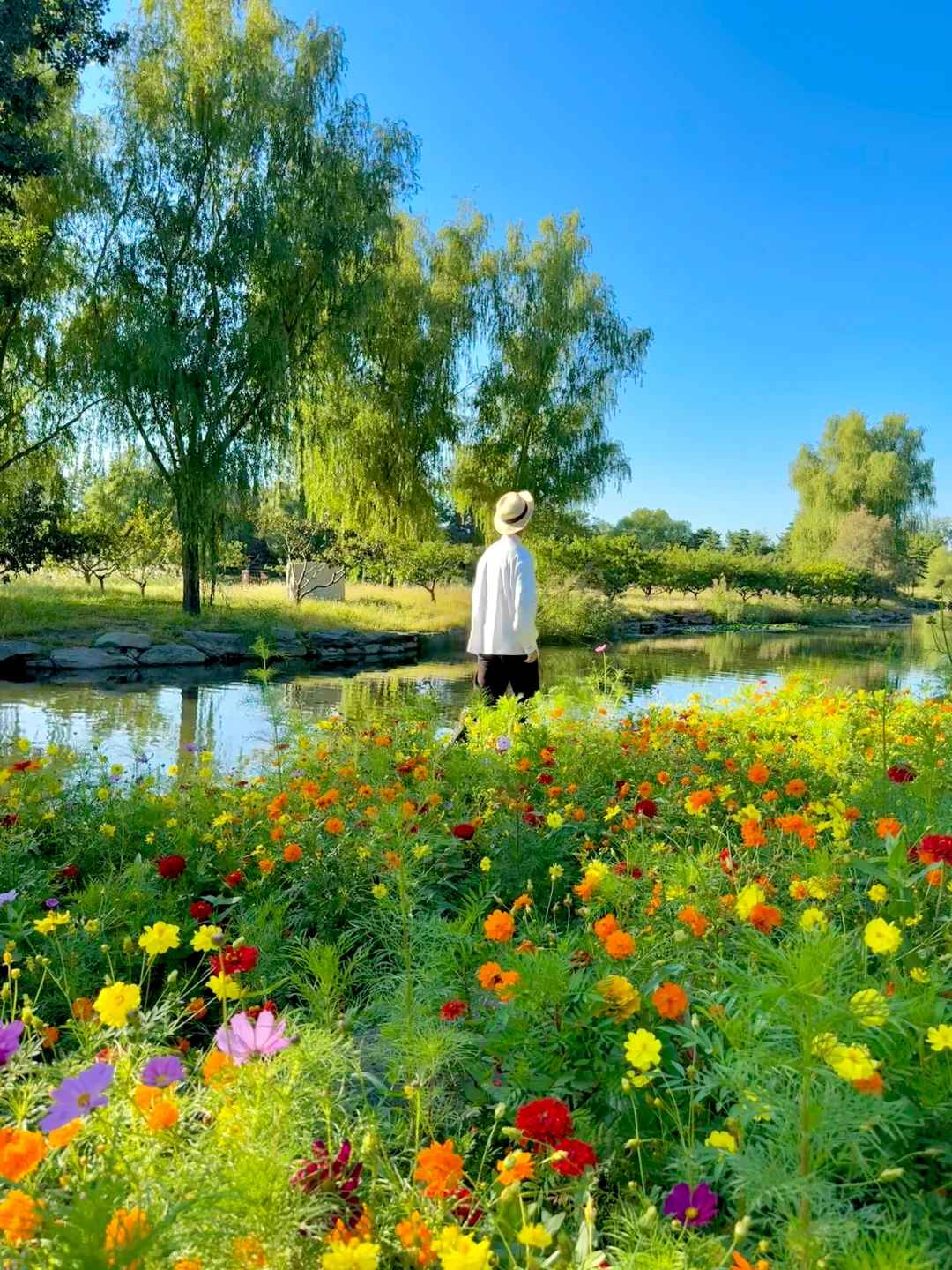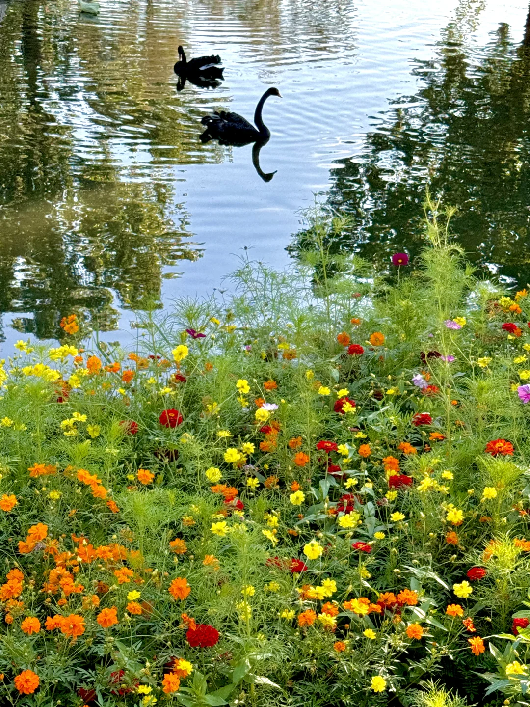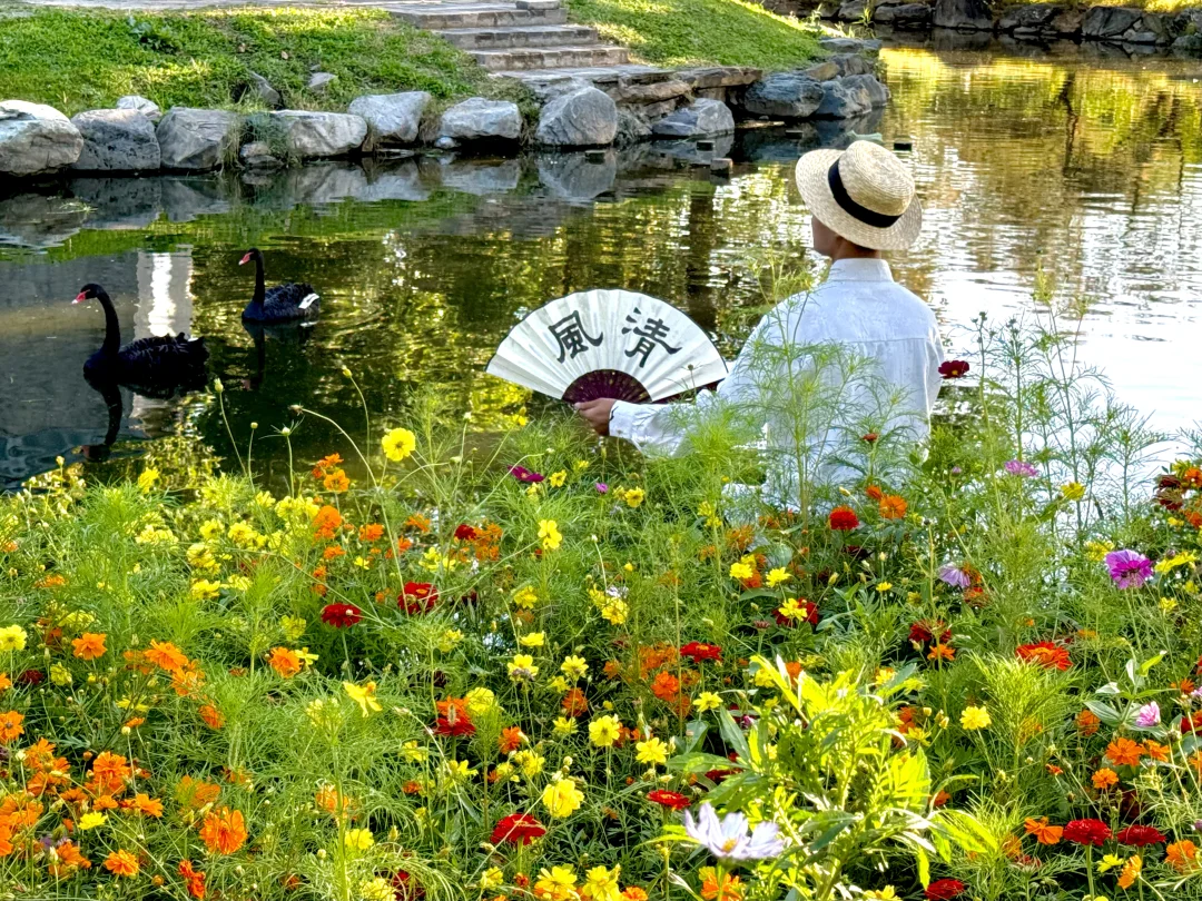 缤纷多彩的波斯菊花海,悠然自得的黑天鹅