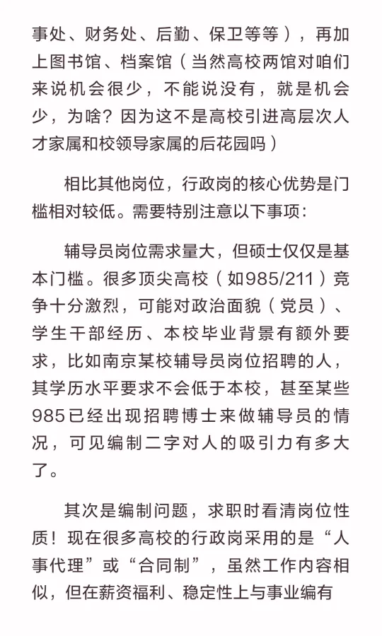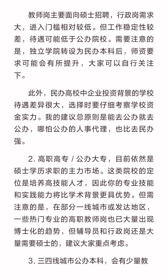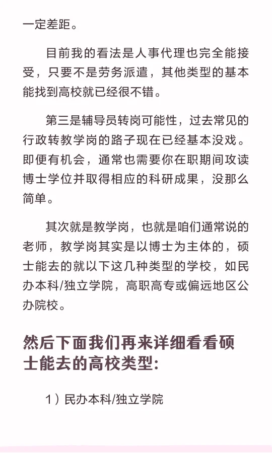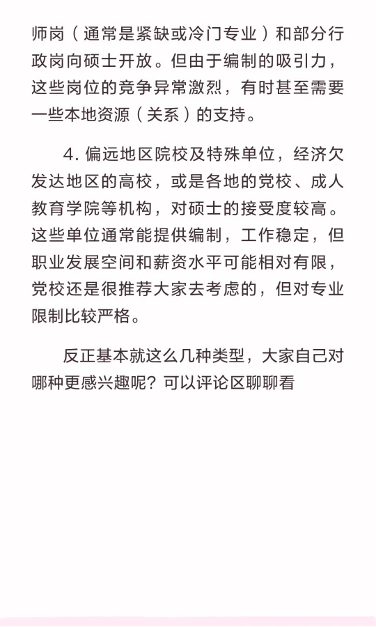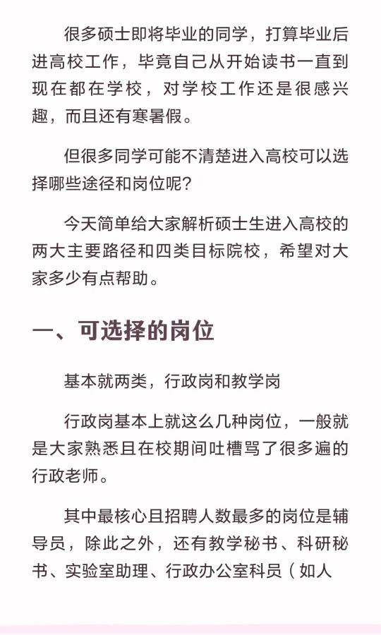 硕士毕业后进入高校可选择行政岗或教学岗,行政岗如辅导员、教学秘书等门槛低,但编制和稳定性需注意。教学岗以博士为主,硕士可投民办本科、高职高专、偏远地区公办本科等院校,职业发展空间和薪资水平有限高校求职 高职求职 高职招聘 研究生 找工作 求职 求职招聘 你更倾向教师岗还是行政岗?