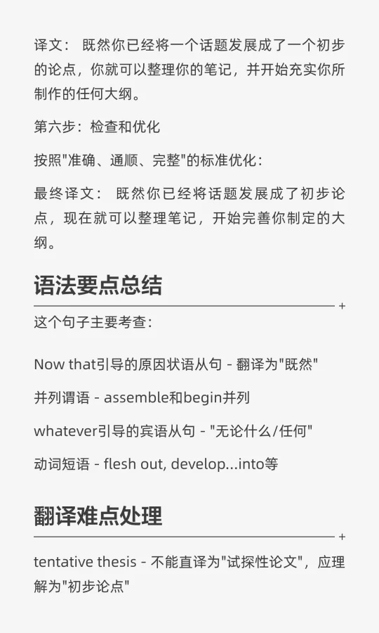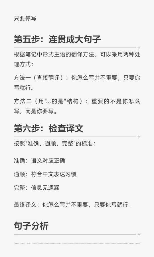 *笔记产出方法:将唐静老师26考研翻译笔记给到AI大模型,提示词为:吃透这份笔记讲的内容,后面根据这份笔记为我做题,撰写题目解析,然后给它真题句子让他按照步骤输出即可!