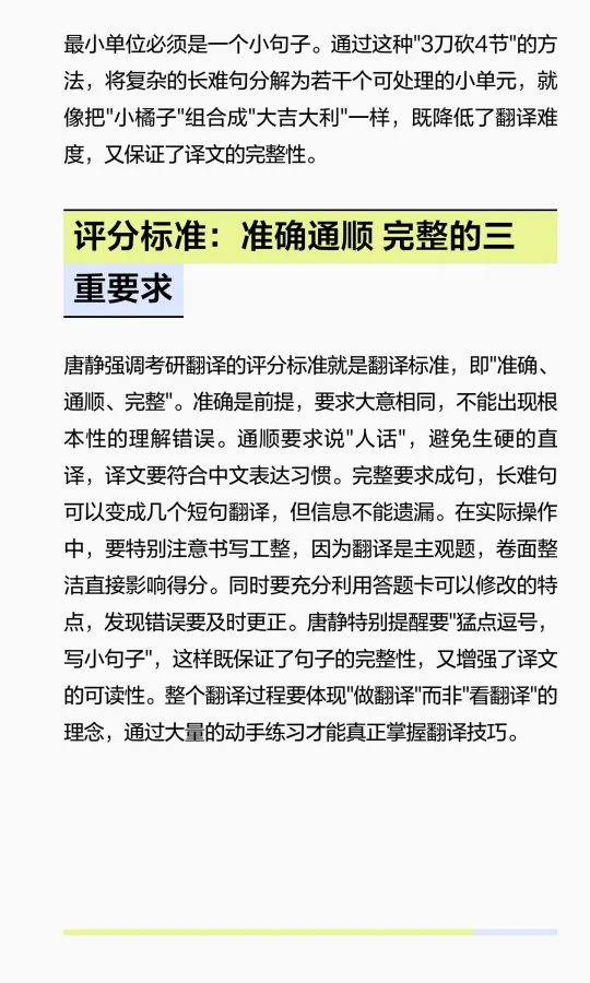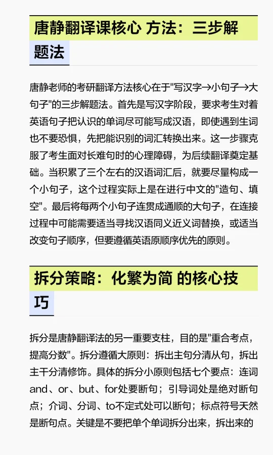 唐静翻译课核心方法:三步解题法(写汉字→小句子→大句子),拆分长难句,确保准确、通顺、完整。通过拆分和小句子构建,降低翻译难度,保证译文完整。