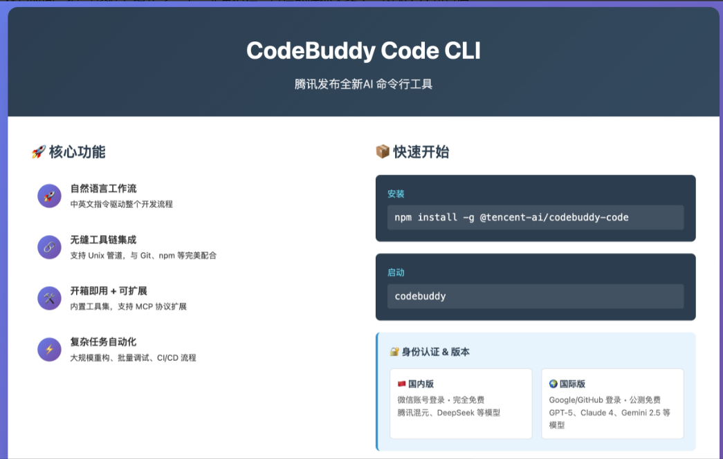 其实CodeBuddy Code早就有了,这次发布新增了命令行模式。 分为国内版和国际版,两个版本现在都免费,国际版配齐了主流模型:Claude 4.0、gpt-5 和 Gemini Pro 2.5随便选,国内版可选 DeepSeek和腾讯混元模型。