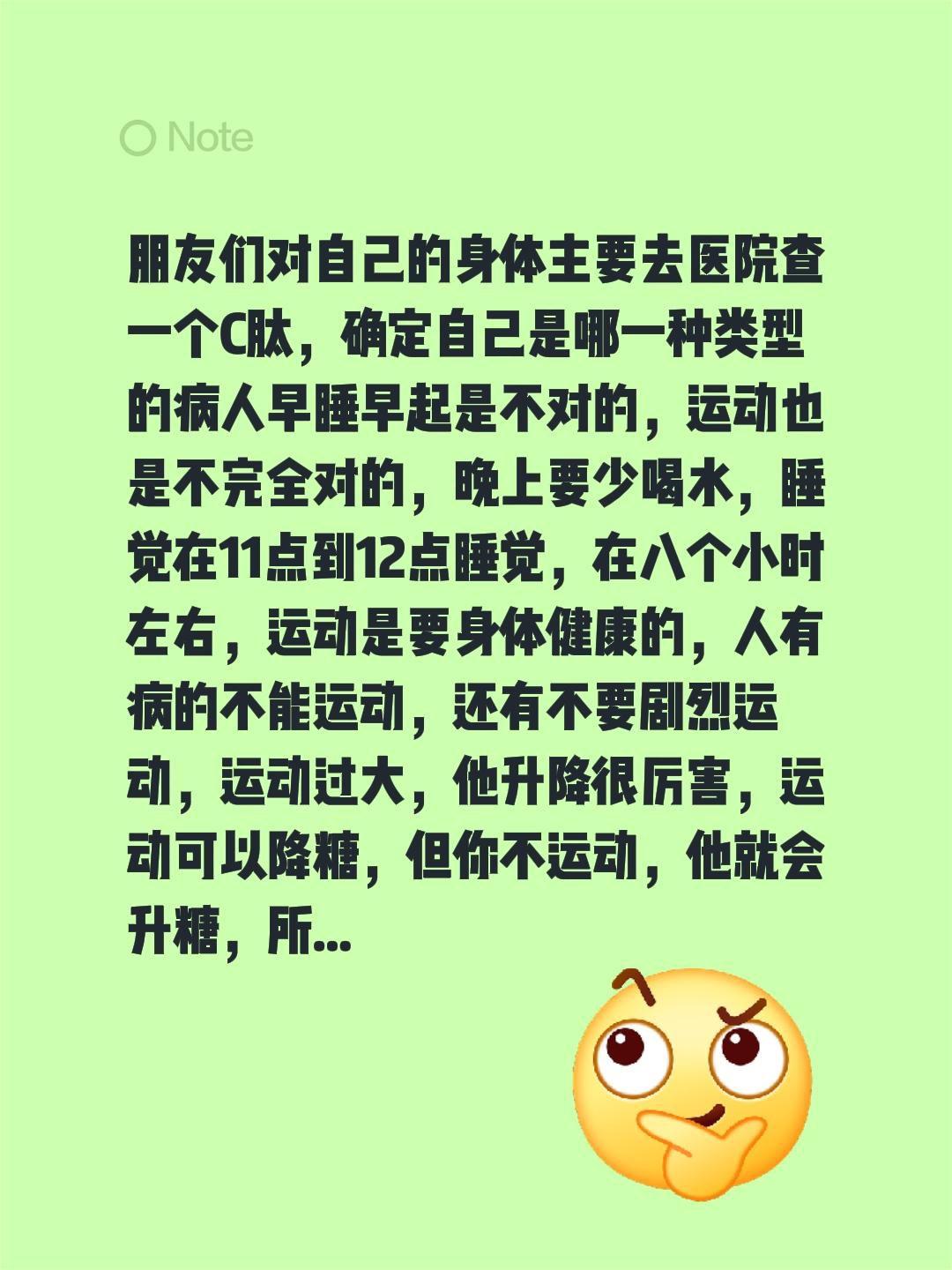 我评论了@温柔媚娘 的作品: 朋友们对自己的身体主要去医院查一个C肽,确定自己是哪一种类型的病人早睡早起是不对的,运动也是不完全对的,晚上要少喝水,睡觉在11点到12点睡觉,在八个小时左右,运动是要身体健康的,人有病的不能运动,还有不要剧烈运动,运动过大,他升降很厉害,运动可以降糖,但你不运动,他就会升糖,所以说掌握好吃饭吃片片打素素就可以了,不需要运动,如果是太肥胖的人,他就要减肥运动
