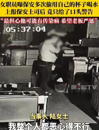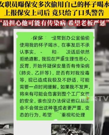 广东中山,女子查监控,竟看到是保安几乎天天趁她下班,用她的杯子喝水。女子胃里瞬间翻江倒海,恶心得直呕,更让她担心的是,万一他有传染病,那可就麻烦了。她越想越害怕,将此事反映给了领导,但领导的处理方式让她难以接受。 “太恶心了!怎么随便用别人的杯子!万一有什么传染病怎么办!”张女士(化名)十分愤怒,她万万没想到自己下班后把水杯放在自己工位上,居然被保安大叔偷偷使用!这事儿,让她心里堵得慌,好几天都没睡踏实! 事发当天,张女士像往常一样,早起来到公司工作,拖着疲惫的身子准备上班。她走到自己的工位旁,习惯性地想去拿杯子喝口水,却发现杯子好像和晚上自己放着的时候不太一样。 杯子的盖子,似乎被人动过,边缘的缝隙里,还卡着一点点不属于她的痕迹。再仔细一看,杯子里原本泡着的茶叶,竟然没了踪影,只剩下一些残留的、被水浸泡得发胀的茶叶碎末,孤零零地躺在杯底。 张女士心里七上八下的,一个不好的念头瞬间冒了出来。她平日里很注重个人卫生,杯子从不外借,而且早上走的时候,杯子里明明还有不少茶叶和水。难道是有人用了她的杯子?这个想法让她胃里一阵翻江倒海,恶心的感觉直往上涌,差点当场吐出来。 越想越觉得不对劲,张女士立刻找到了公司的监控室。在监控画面里,接下来看到的场景,让她浑身的鸡皮疙瘩都起来了。画面显示,几乎每天她下班后,公司的保安都会悄悄溜进办公室,径直走到她的工位前,拿起她的杯子,就那么堂而皇之地喝起水来。 一次、两次,甚至好几天都是这样,那保安动作熟练得仿佛那杯子就是他自己的。看着监控里保安喝水的样子,张女士只觉得一阵恶寒,胃里的恶心感再也抑制不住,跑到卫生间狂呕起来。 更让张女士害怕的是,万一这个保安有什么传染病,那自己岂不是要跟着遭殃?乙肝、肺炎…… 各种可怕的疾病名称在她脑海里不断闪现,她越想越害怕,整个人都陷入了焦虑和恐慌之中。 缓过神来后,张女士不敢耽搁,立刻把这件事反映给了公司领导。她本以为领导会重视这件事,会给她一个满意的处理结果。 然而,领导的态度却让她大失所望。经理虽然勉强同意让她去医院做检查,但对于保安的处理,却显得十分敷衍。只是轻飘飘地说会去说说那个保安,连最基本的批评教育都算不上。 张女士心里很不是滋味,这根本不是她想要的结果。她再次找到经理,希望公司能重视员工的个人权益和安全,至少把这个保安调离岗位,让他不再有机会接触到自己和其他女同事的私人物品。可经理却面露难色,一个劲地强调,这事要是闹大了,传出去会影响公司的声誉,对公司的形象不好。 这件事在网上传开后,网友们也炸开了锅。有网友说:“这保安也太没边界感了吧,用别人的杯子喝水,多不卫生啊,素质太差了!” 还有网友表示:“公司领导的处理方式也有问题,员工的安全和感受难道不比所谓的‘影响’重要吗?这是在和稀泥啊。” 也有网友担心地说:“要是真有传染病,那后果可太严重了,希望这位女士检查后没事。” 目前,张女士还在等待进一步的处理结果,她只希望公司能真正重视起来,给她一个公道,也给其他员工一个安全的工作环境。 对此你怎么看?欢迎大家在评论区留言讨论。 信源:纵览新闻 发布于2025年4月26日