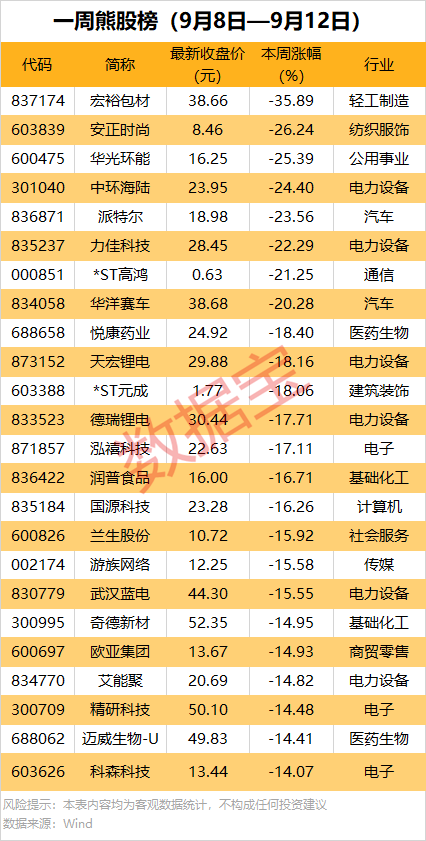 本周累计下跌的个股中,59股跌幅在10%以上,宏裕包材、安正时尚、华光环能和中环海陆等8股累计均跌超20%。