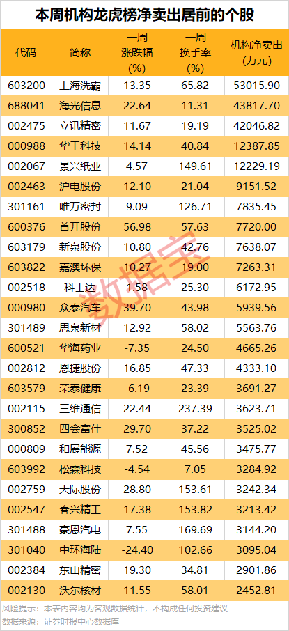 一周机构累计净卖出的个股中,5股金额均超1亿元,其中净卖出金额最多的是上海洗霸,达5.3亿元。该股本周累计上涨13.35%,周换手率为65.82%,因连续三个交易日内,涨幅偏离值累计达26.97%等1次上榜龙虎榜。买卖居前营业部中机构合计净卖出5.30亿元,同时上榜的还有沪股通专用席位,净买入981.24万元;营业部席位一周合计净买入2.09亿元。