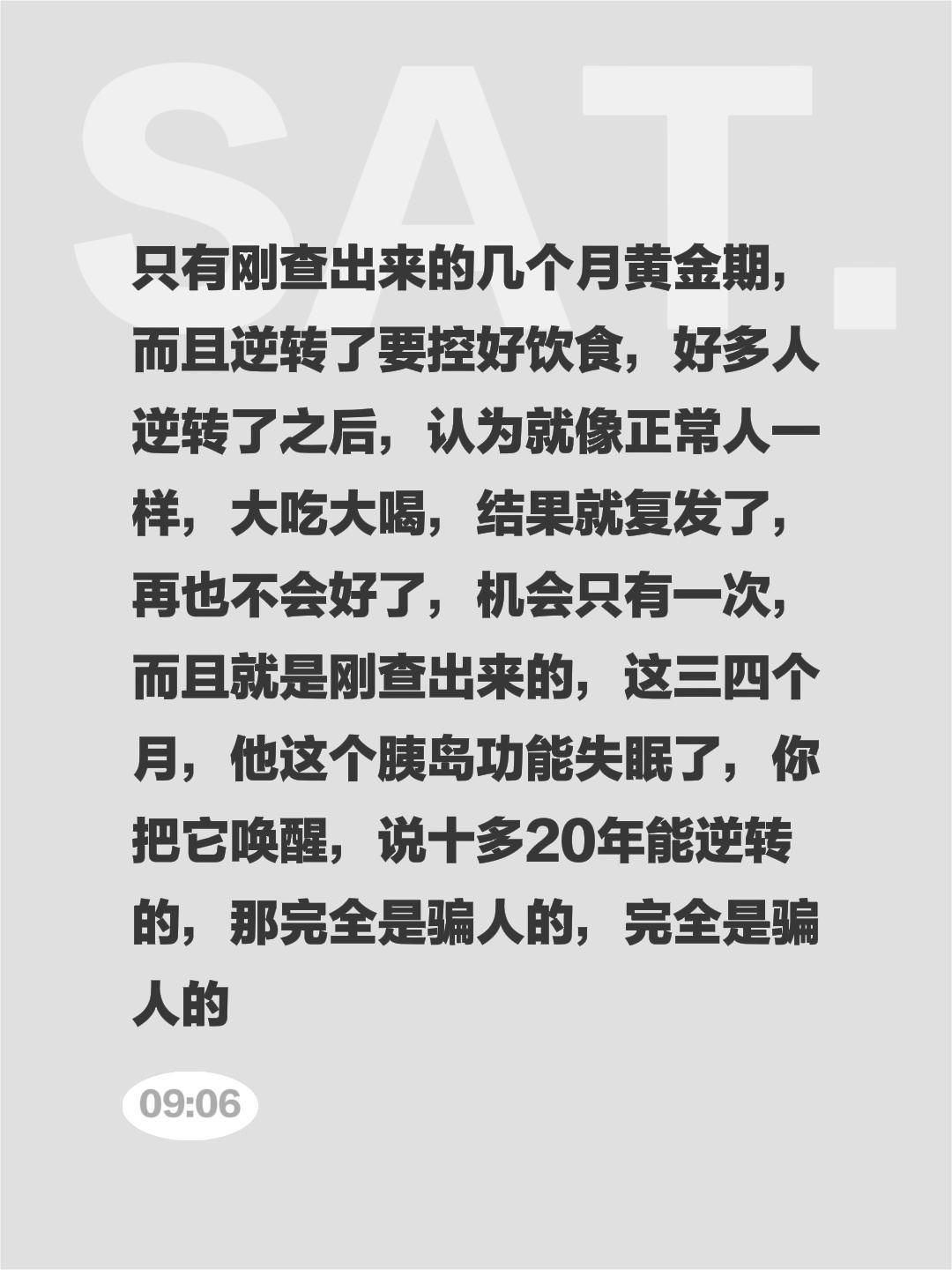我评论了@老吴话糖 的作品: 只有刚查出来的几个月黄金期,而且逆转了要控好饮食,好多人逆转了之后,认为就像正常人一样,大吃大喝,结果就复发了,再也不会好了,机会只有一次,而且就是刚查出来的,这三四个月,他这个胰岛功能失眠了,你把它唤醒,说十多20年能逆转的,那完全是骗人的,完全是骗人的