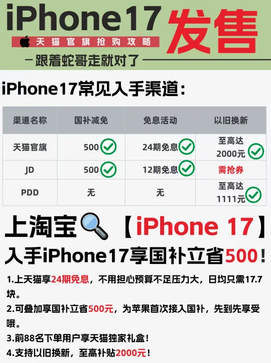 苹果新品天猫首发 买iPhone17上天猫享24期免息 买iPhone17上天猫用国补立减500 元