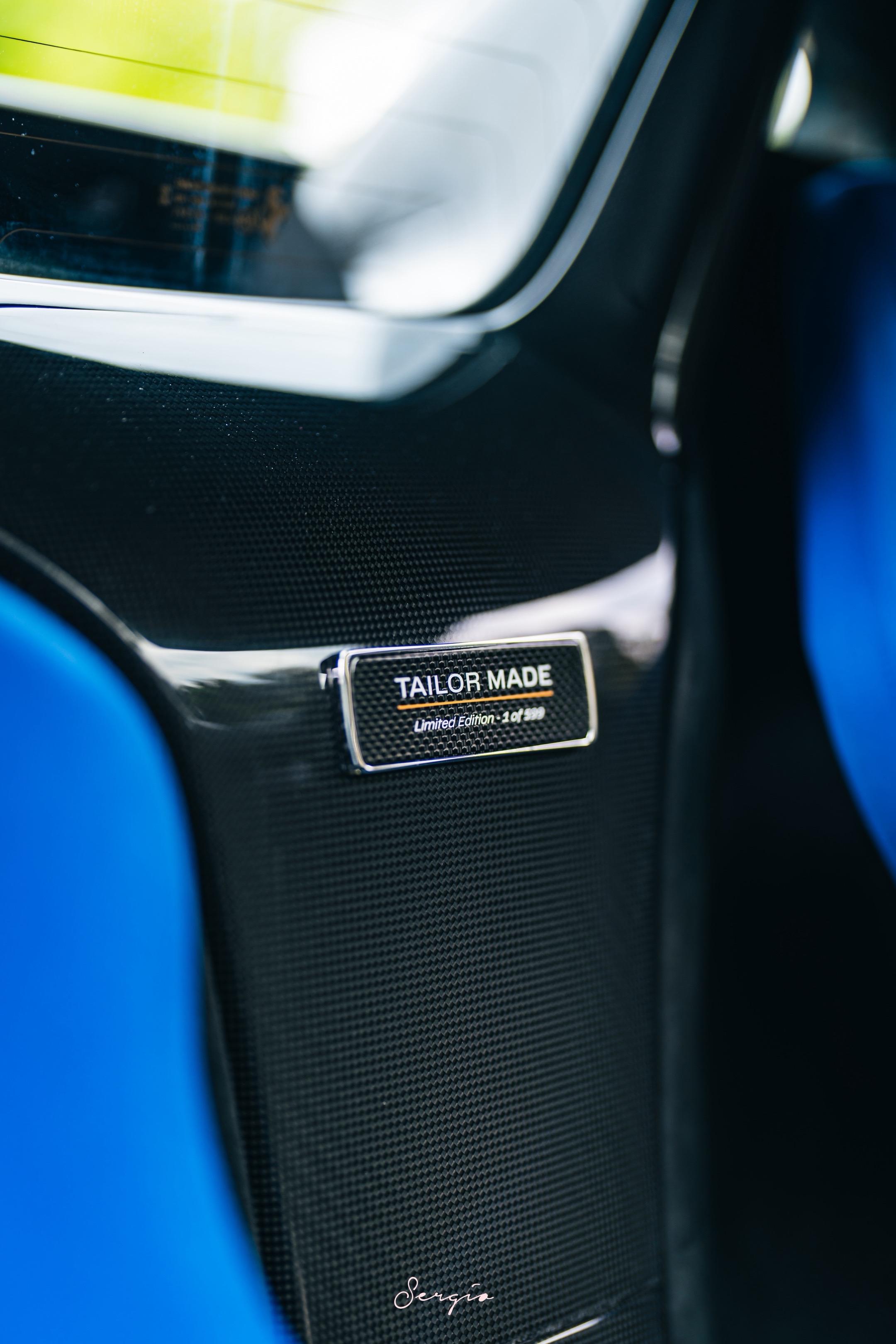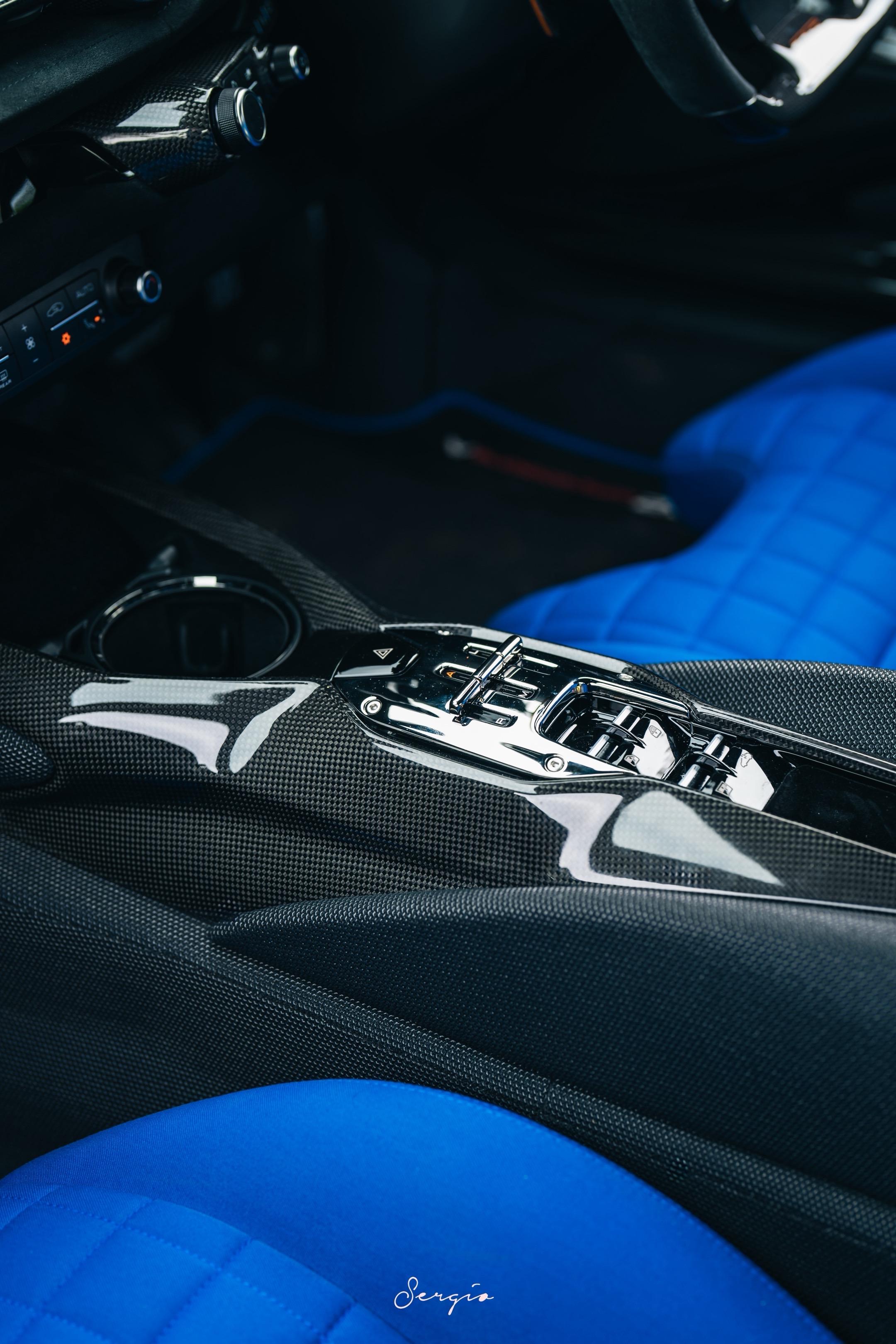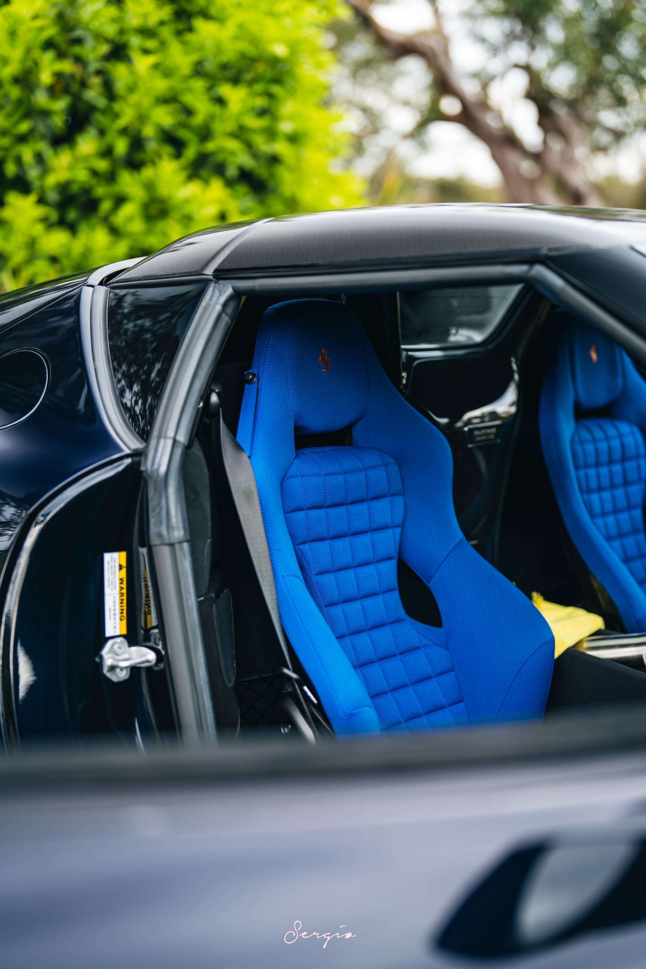 它的外观选用了少见的 Blu Reale 车漆,在阳光下透出紫调,在阴影里则呈现深蓝甚至近黑的质感,有点像“蓝色版的迈凯伦黑曜石色”,视觉效
