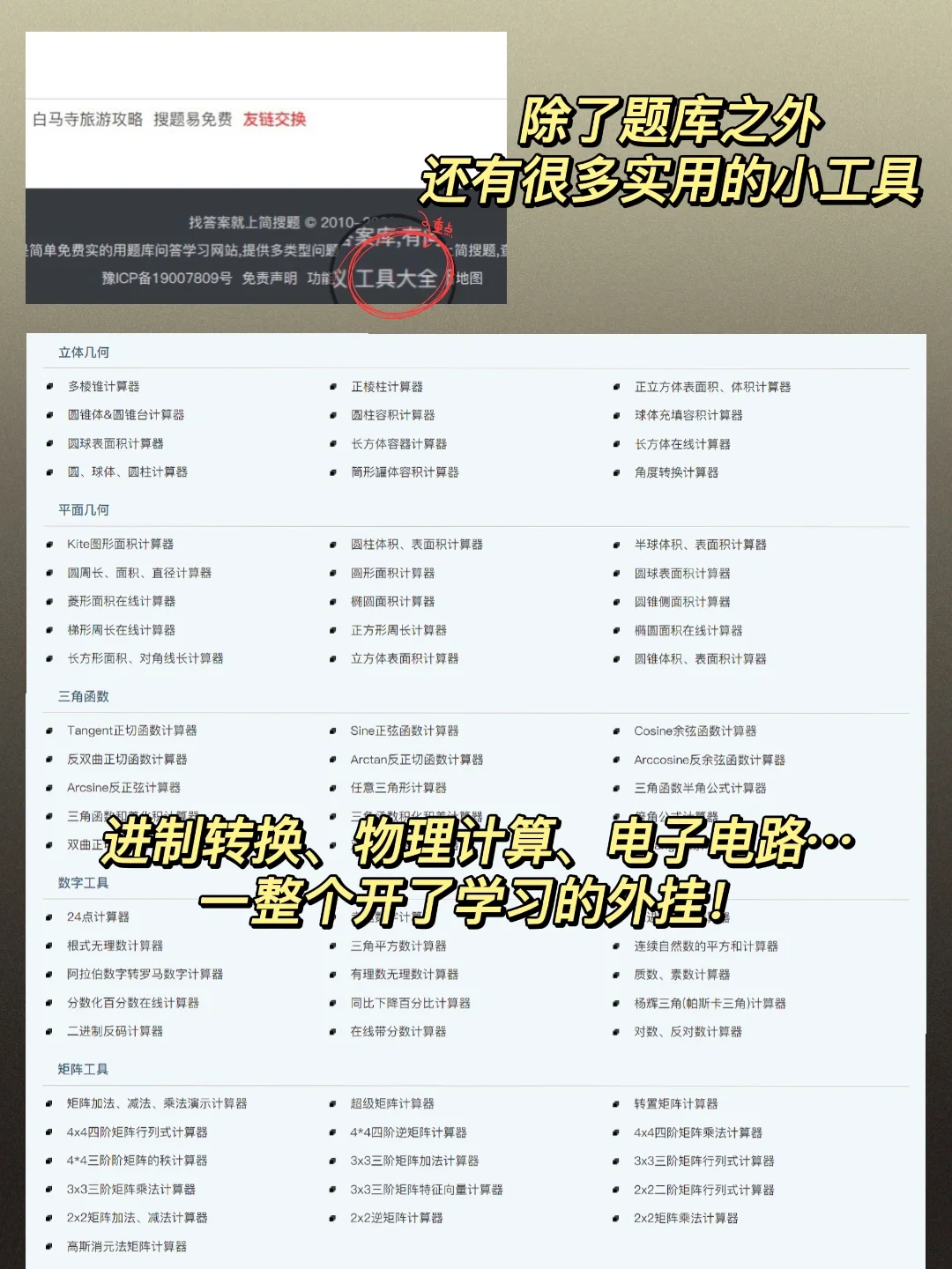 [蓝色心形R]除了题库丰富还有解析之外,还有很多超级无敌实用的小工具,进制转换、物理计算、电子电路…一站式学习我真的爱了爱了~