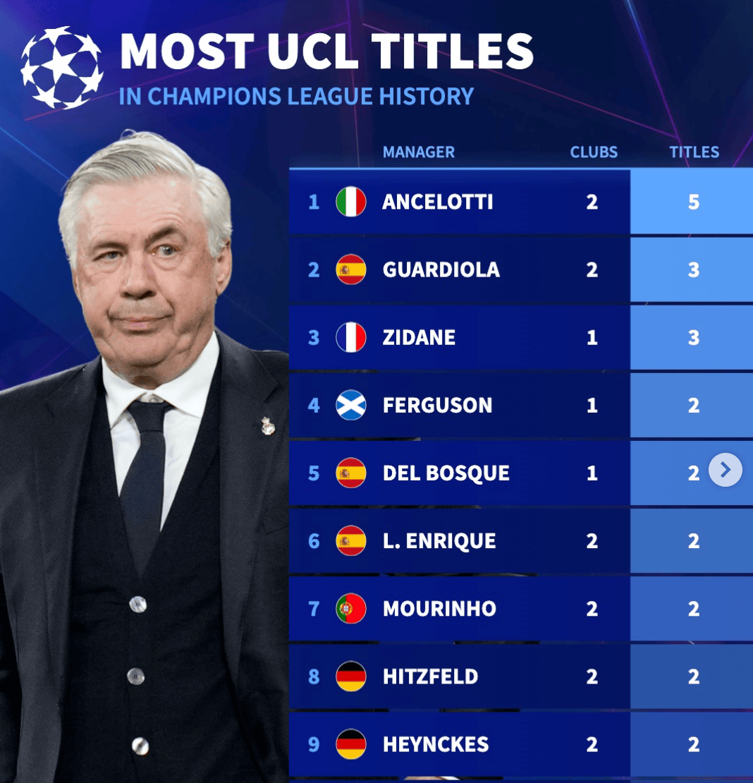 1.安切洛蒂:2队(AC米兰、皇马),5次