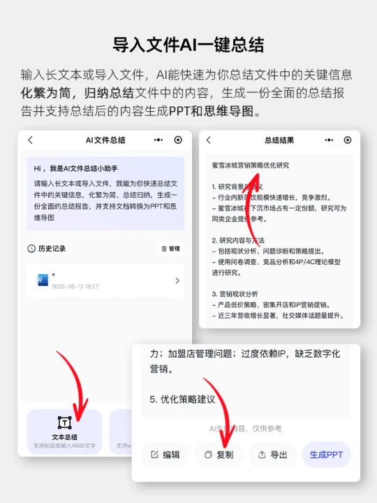 不管是几十页的报告还是万字长文,导入进去AI立马提炼关键信息,化繁为简生成清晰总结。重点是!总结完还能直接转PPT或思维导图,汇报思路瞬间清晰!