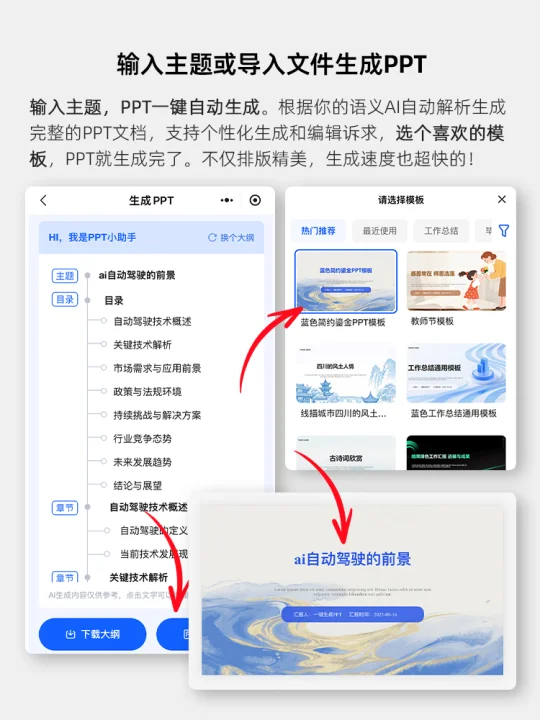 不用自己找模板排版式,AI自动解析语义,连逻辑框架都给你搭好,选个喜欢的模板一键生成,排版精致到像专业设计做的,5分钟搞定以前2小时的活!