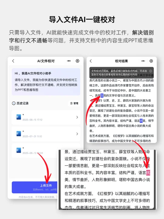 写完的文档导入,错别字、语句不通顺全给你揪出来,比自己反复读10遍还管用。校对完想转PPT?照样一键搞定,再也不用改完文案又熬夜调PPT!