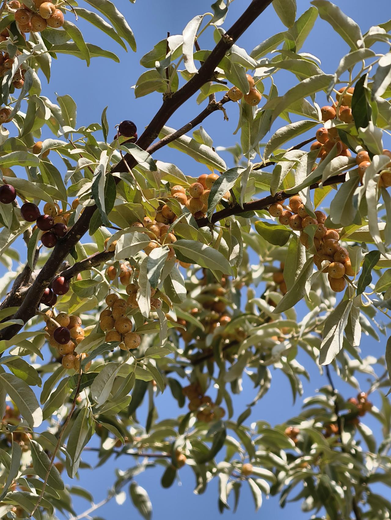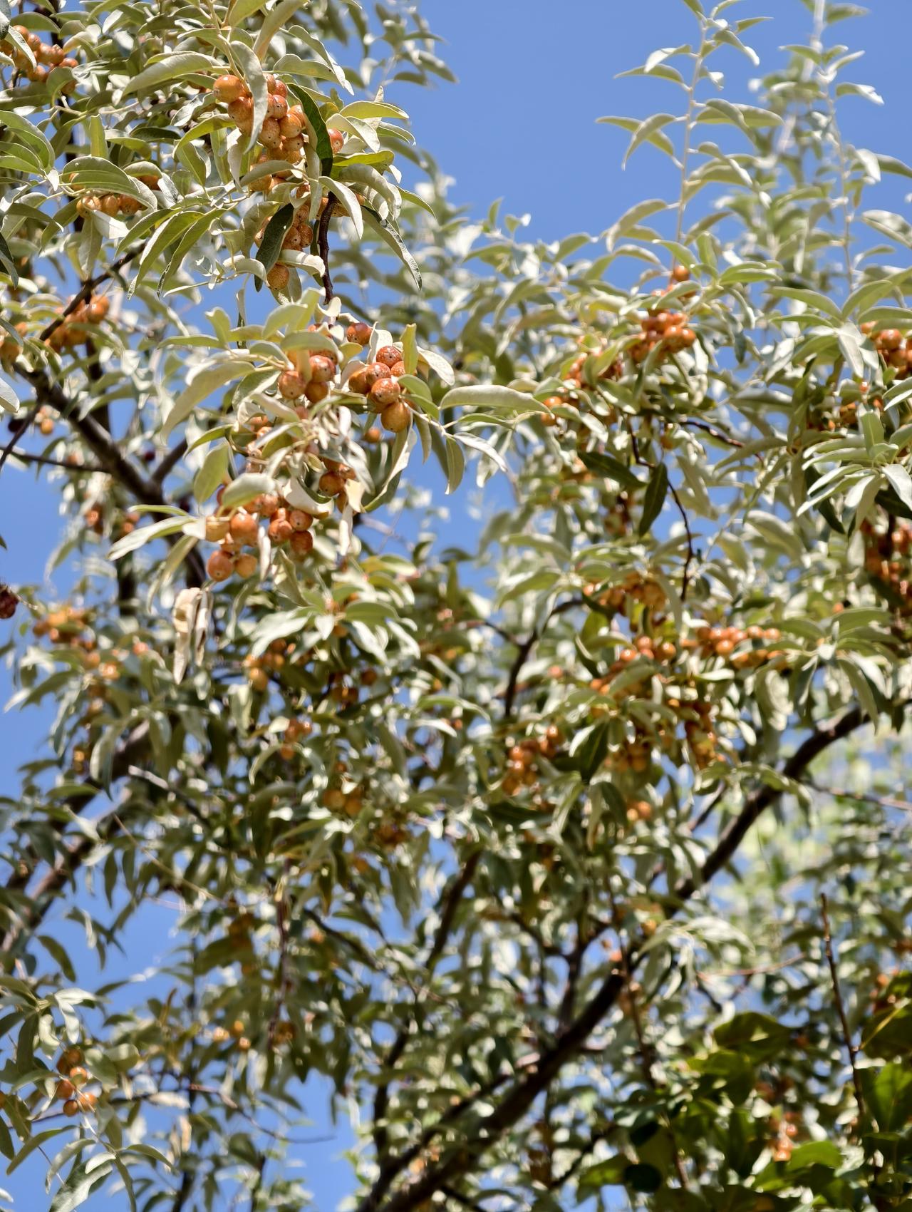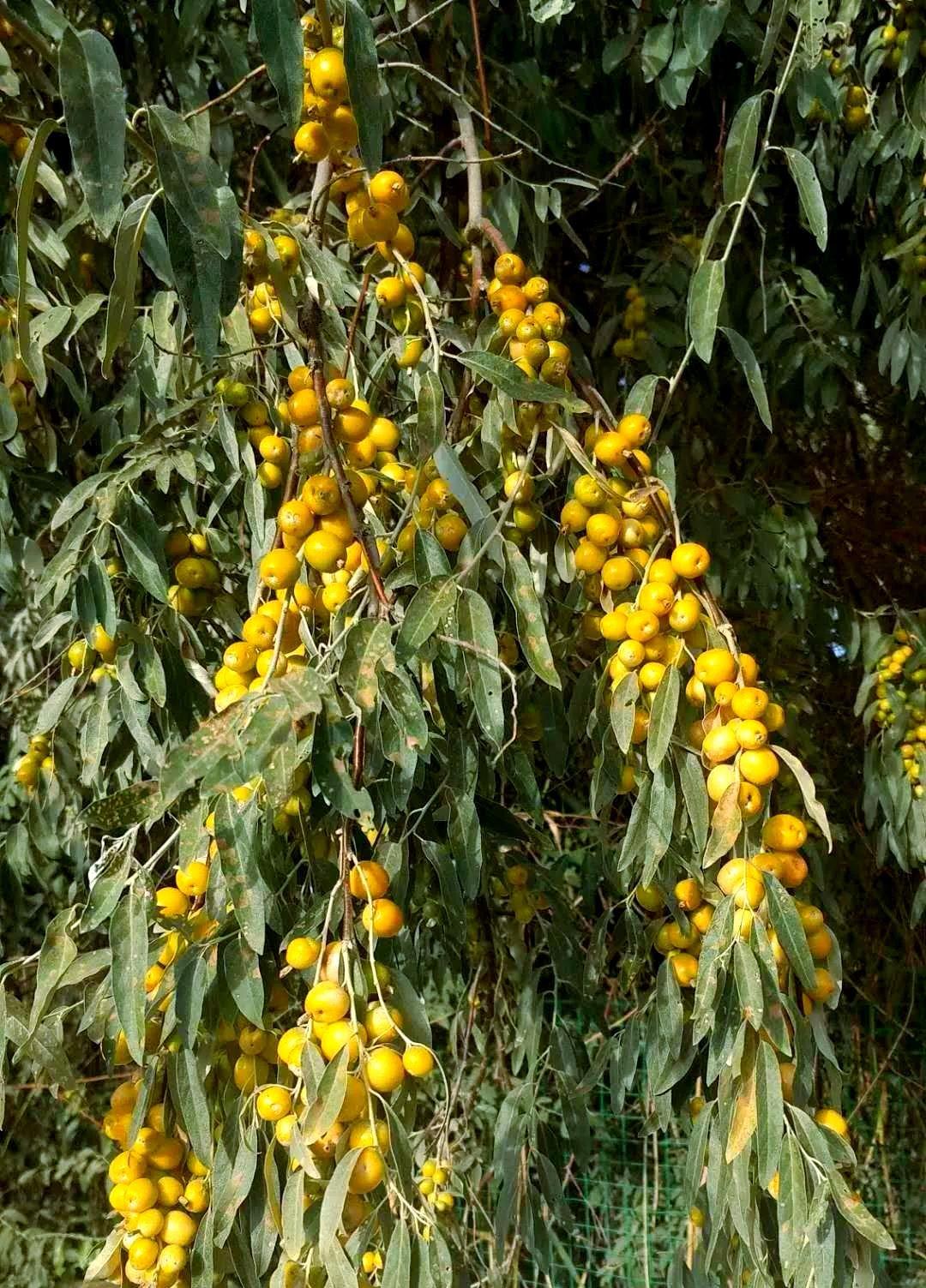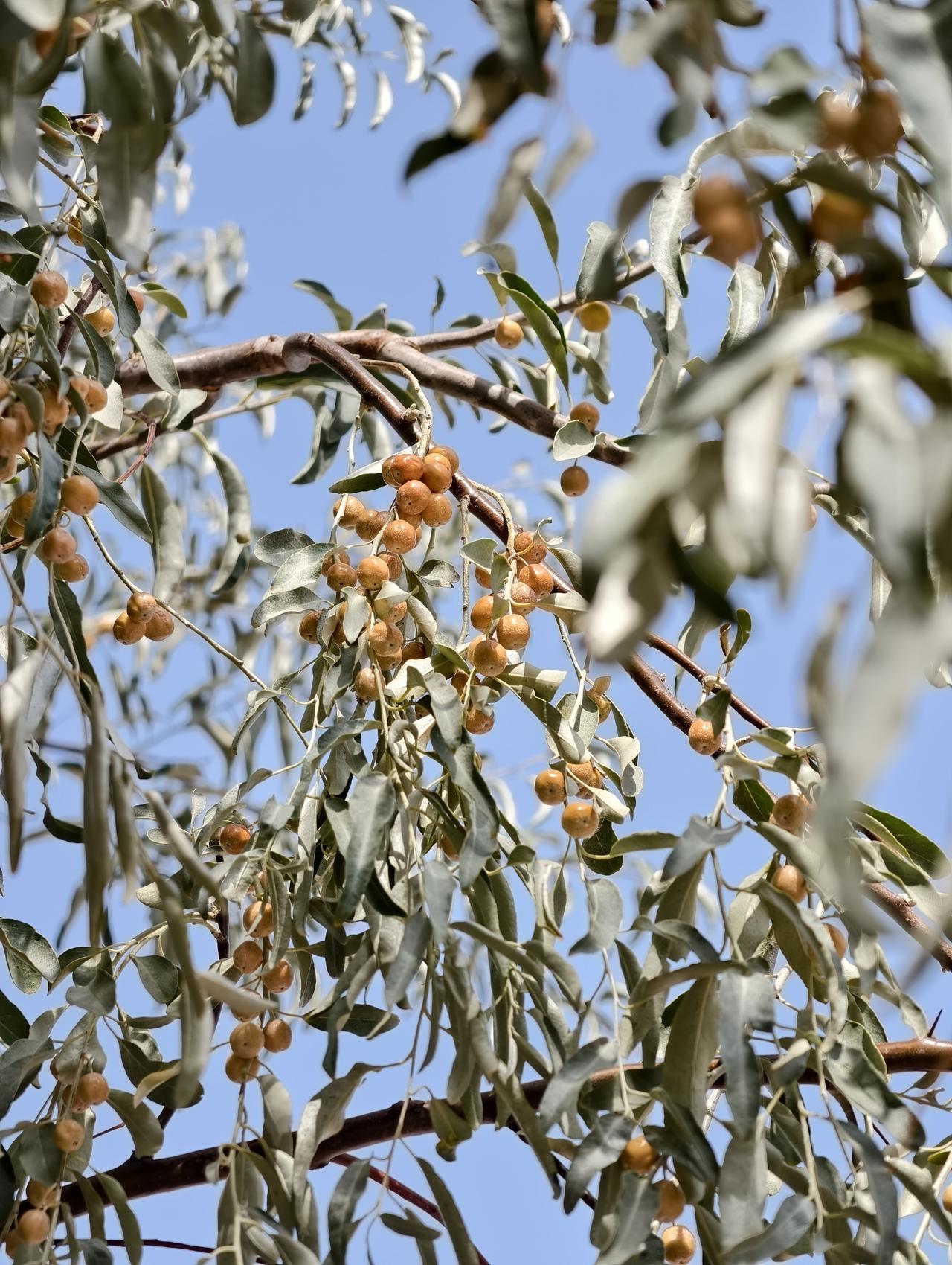 沙枣熟了 龙山沙枣味绵甜, 九月金黄映碧天。 硕果垂枝树枝弯, 颗颗串串似婵娟。