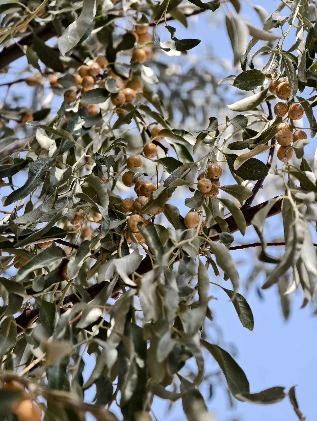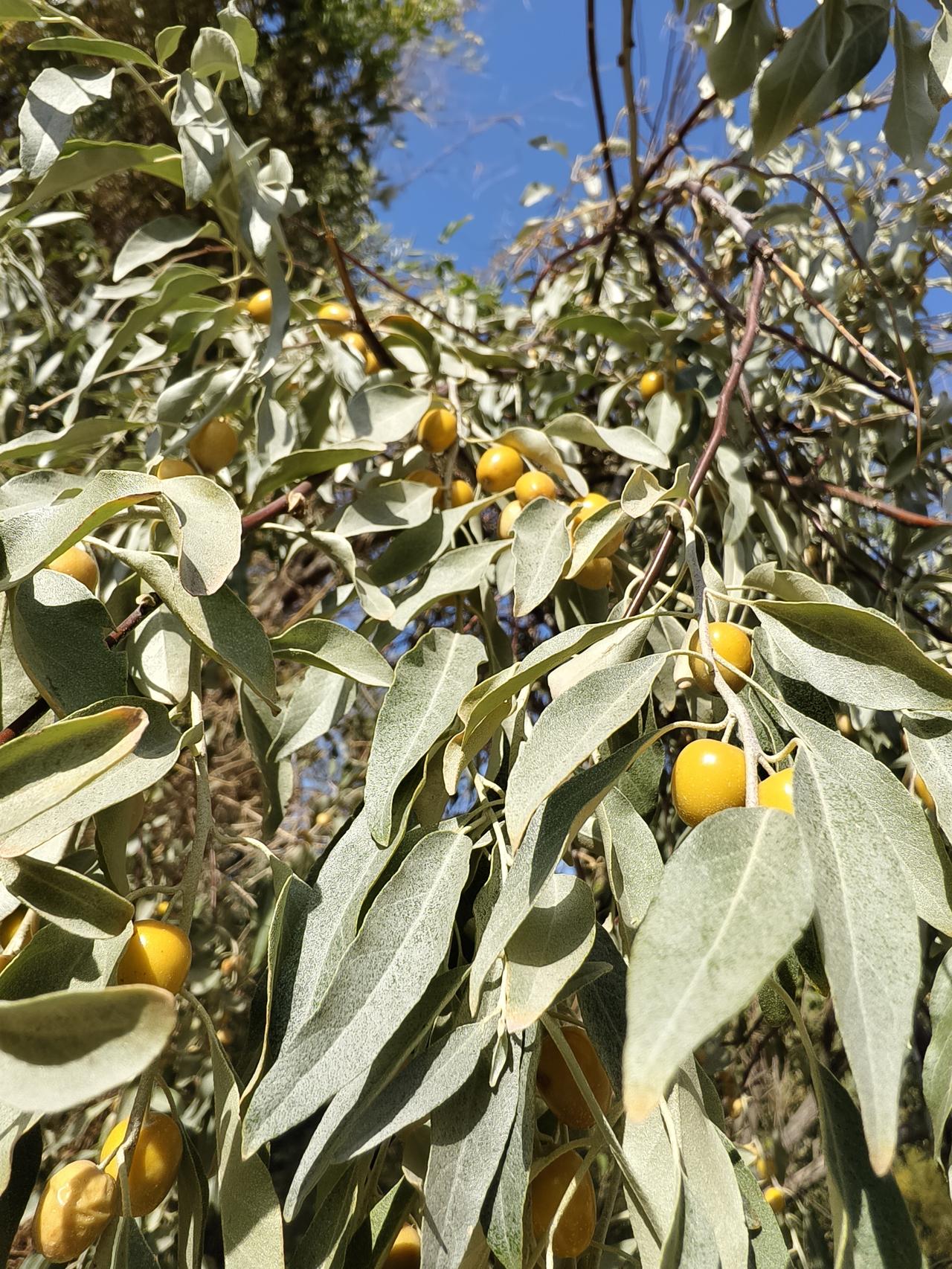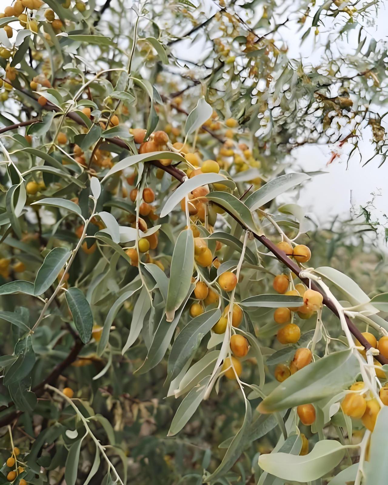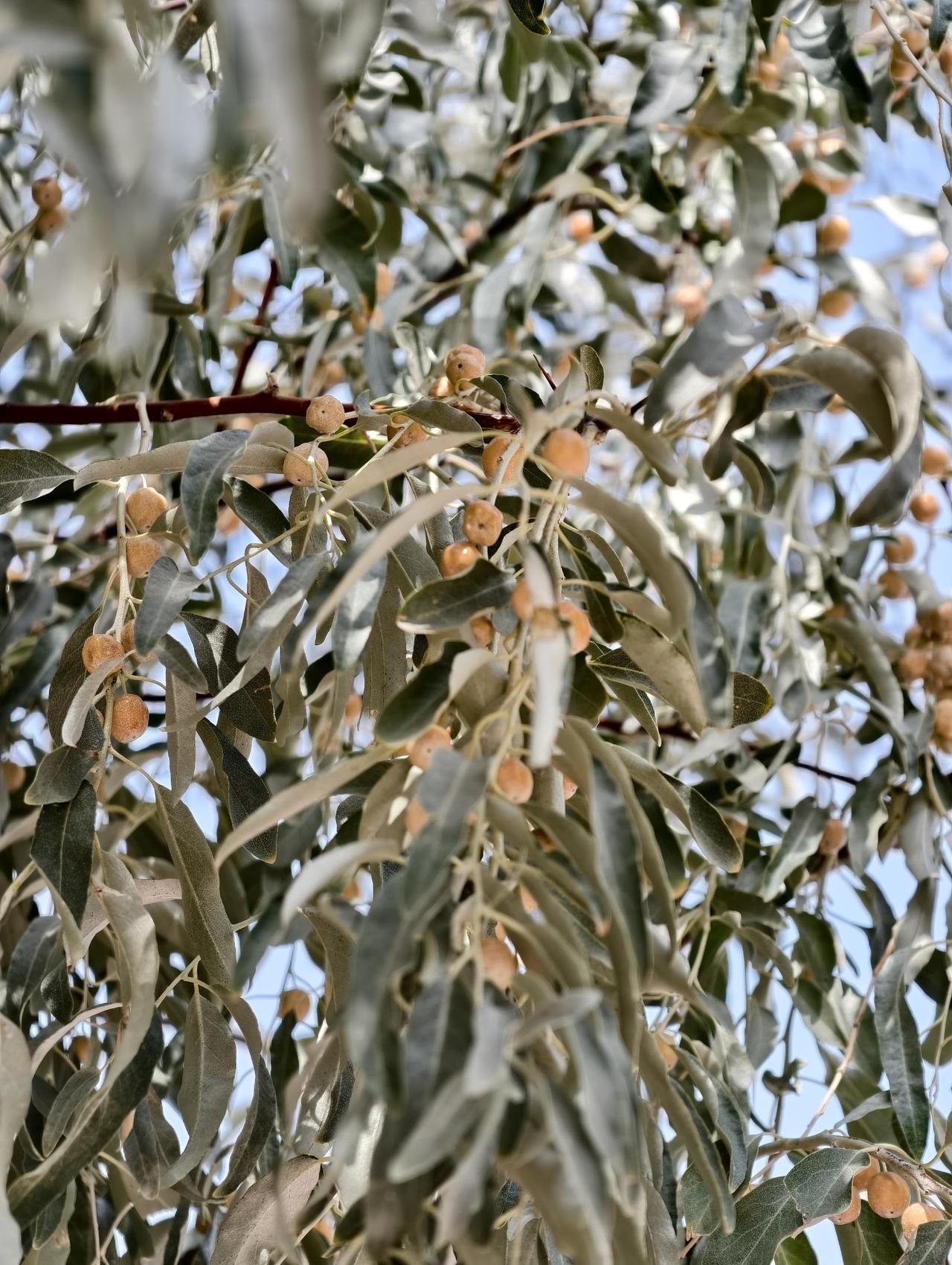 沙枣熟了 龙山沙枣味绵甜, 九月金黄映碧天。 硕果垂枝树枝弯, 颗颗串串似婵娟。