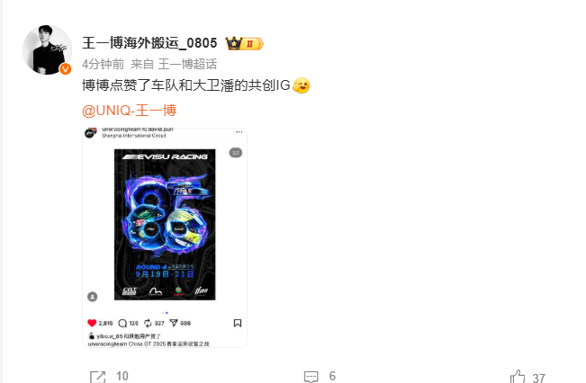 车队和大卫潘联合推出的IG内容获王一博点赞,互动中藏着对合作的肯定,为这份共