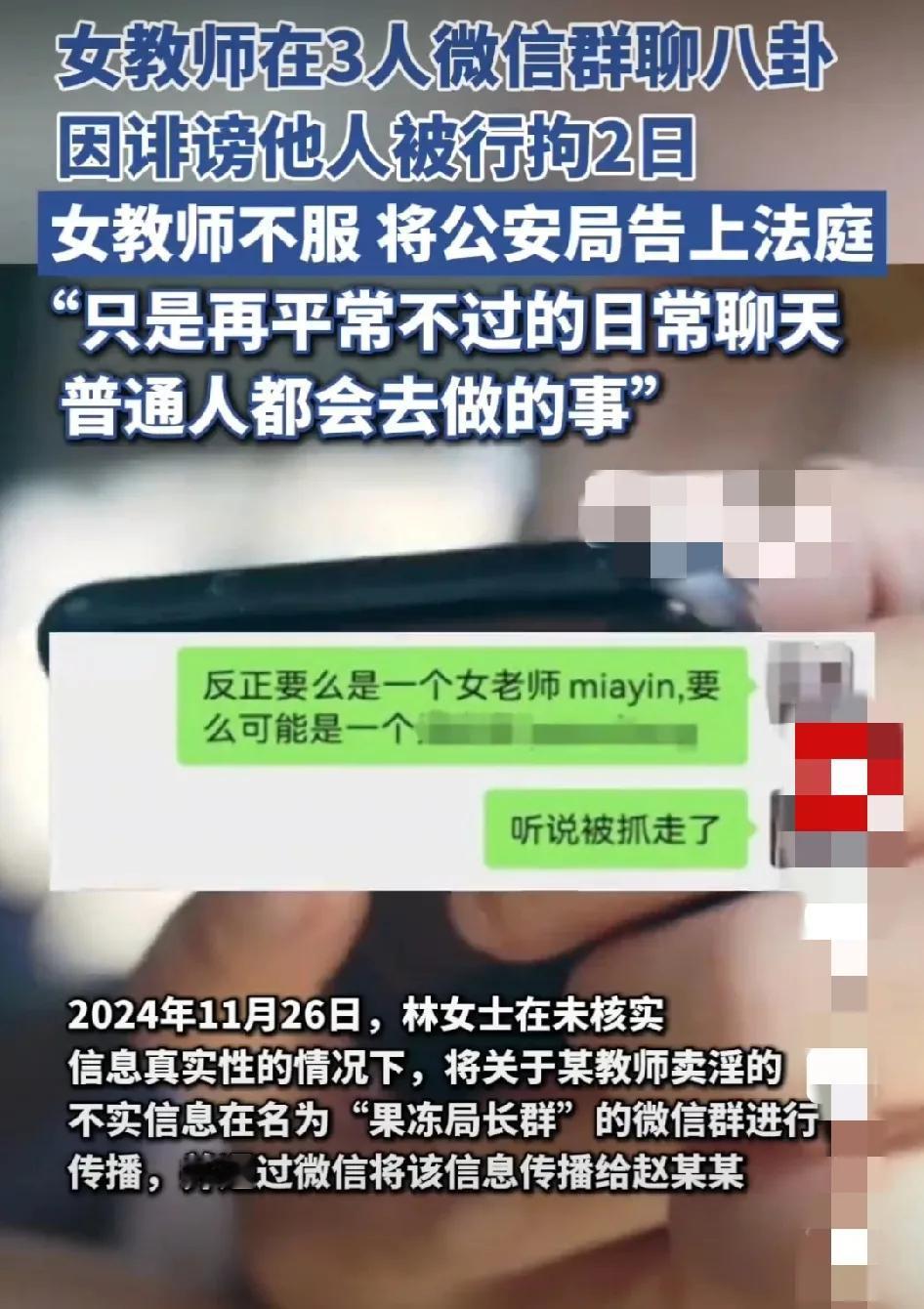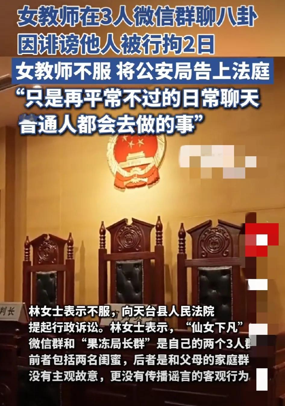 这是有卖友求荣和大义灭亲之人呗!这赶上谍战片了,为了秘密前仆后继,不惜代价起诉争气!以后,吹牛皮的要注意了,上税!都看开点,古人云:谁人背后不说谁,谁人背后不挨说!心态要平和,有些人喜欢凑乎疯狗咬傻子!也有人喜欢隔山观虎斗,卧桥看河流!所以说,童言无忌大风吹去! 据报道,林女士因在两个微信群(“果冻局长群”和“仙女下凡”)传播关于某教师的不实信息被天台县公安局处以行政拘留2日的处罚。她认为自己在亲友小范围群聊属于私人交流,未造成社会影响,故提起诉讼要求撤销处罚并索赔。 林女士强调自己未故意传播谣言,两个群分别为闺蜜群和家庭群,具有私密性; 再有,警方认定其行为导致被诽谤教师名誉受损,工作生活受干扰。 另外,支持者认为私人社交平台仍需遵守法律规范,尤其是涉及人身攻击或虚假信息时;质疑者则认为小范围非公开群聊不应等同于公开传播。 最后,该案将通过司法裁决明确网络言论自由与法律边界的界定标准。