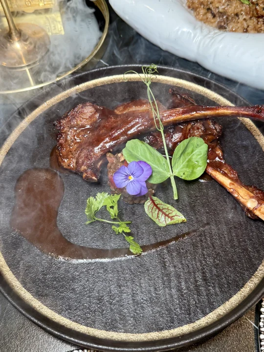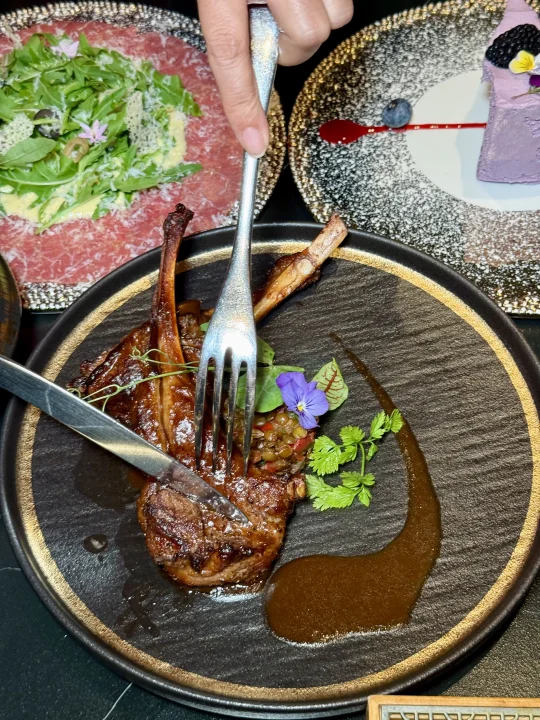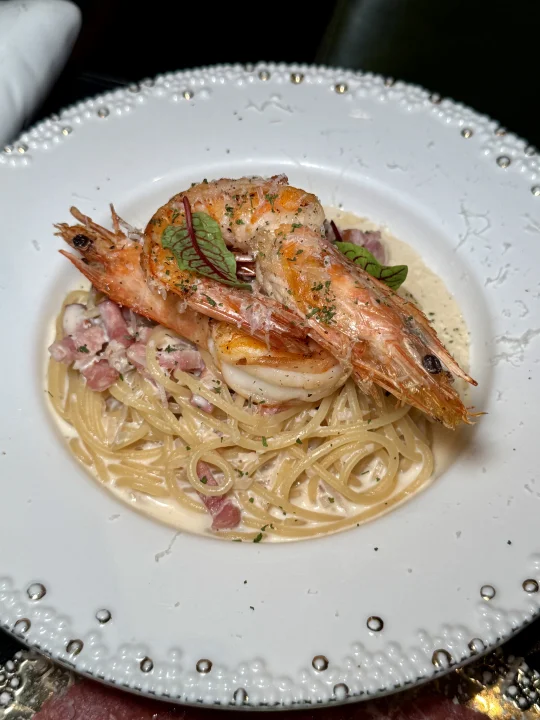 奶油烟熏咸肉煎虾蛋黄意面🍝、炭烤羊排配迷迭香红酒汁都没有踩雷,约会可以点