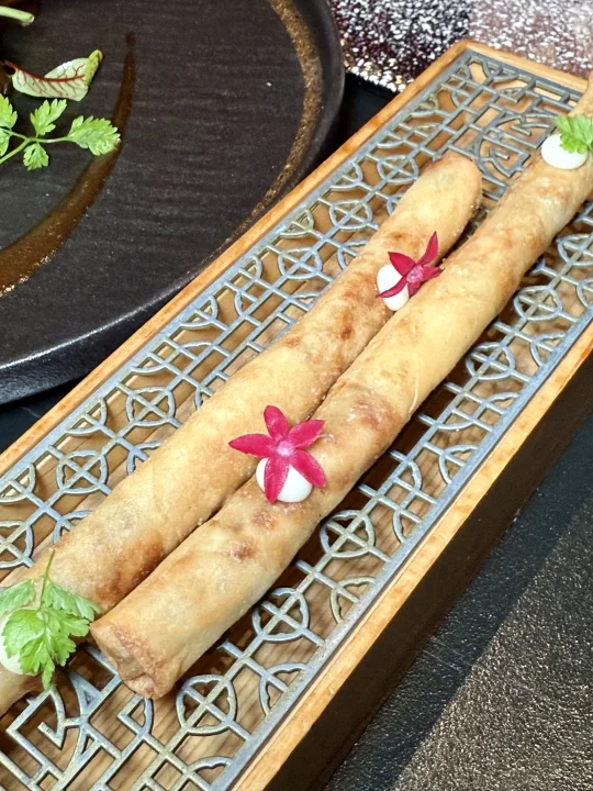 摆盘很精致,比起钢笔我觉得更像玉笛?一咬薄薄脆壳,解除封印,鸭肉馅儿带着香菜呼之欲出~调味是酸汁,准确来说是酸豆角汁儿,是没想到的调味,应该是店家自己研究出来的~蛮特别的