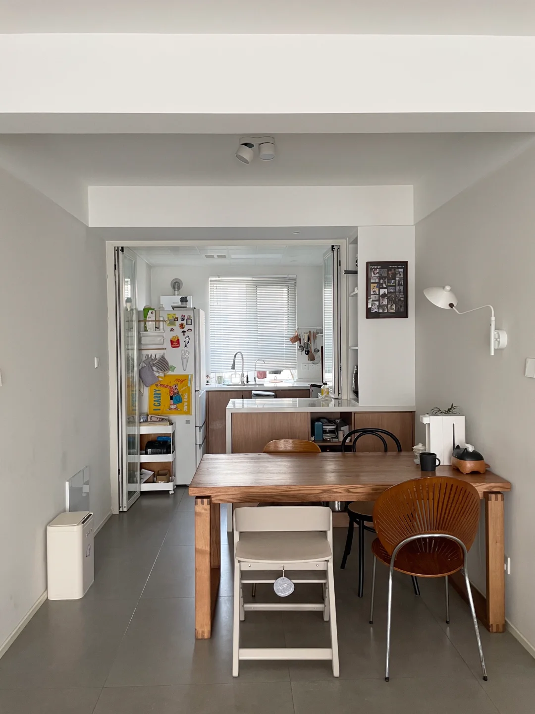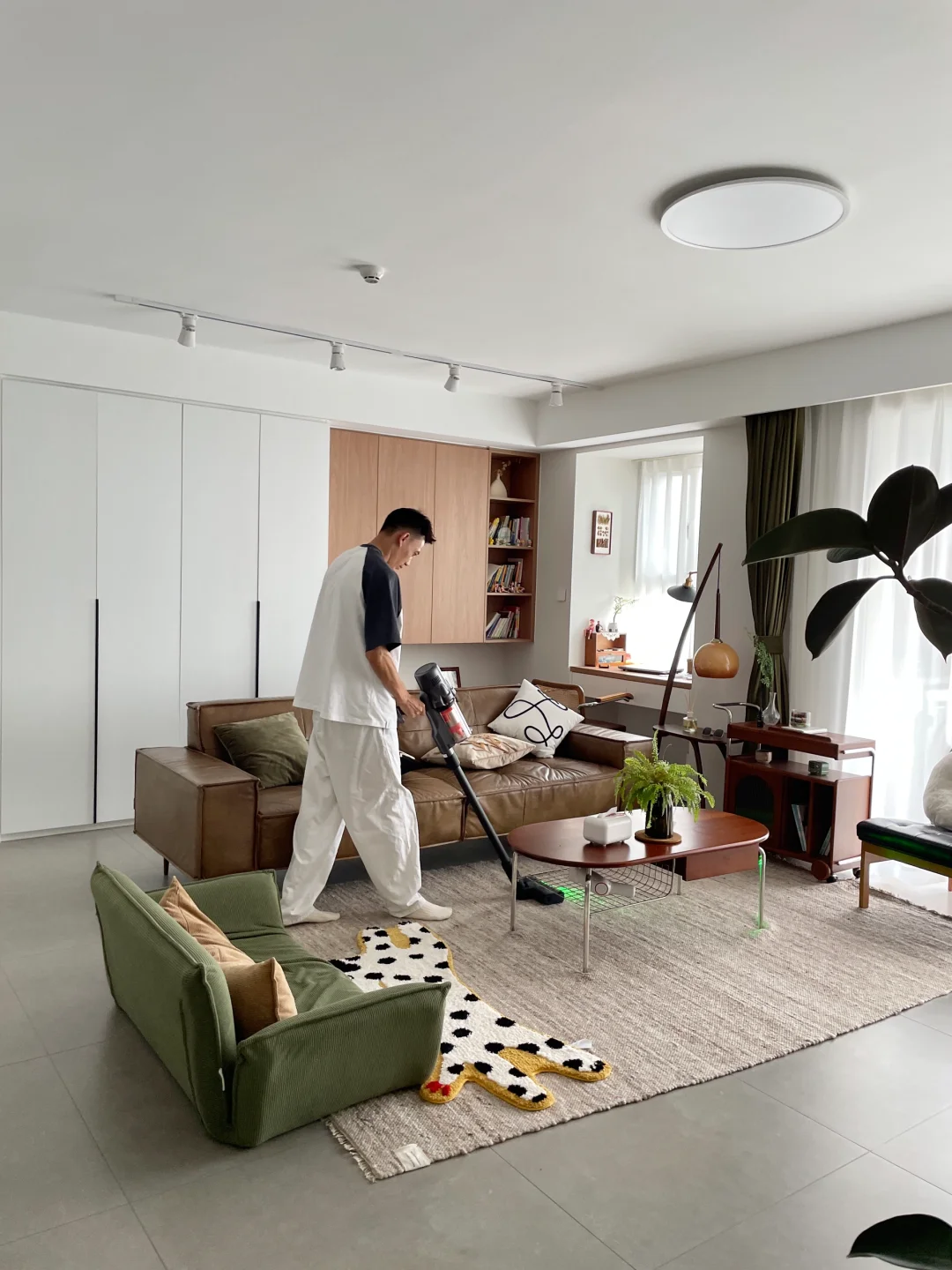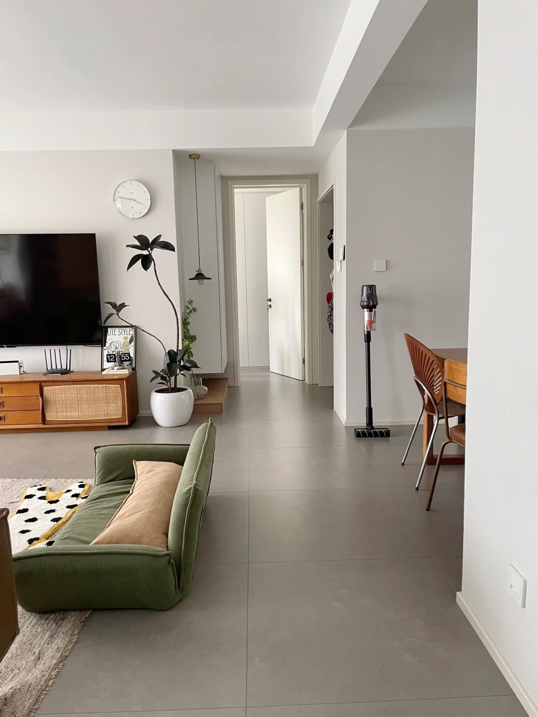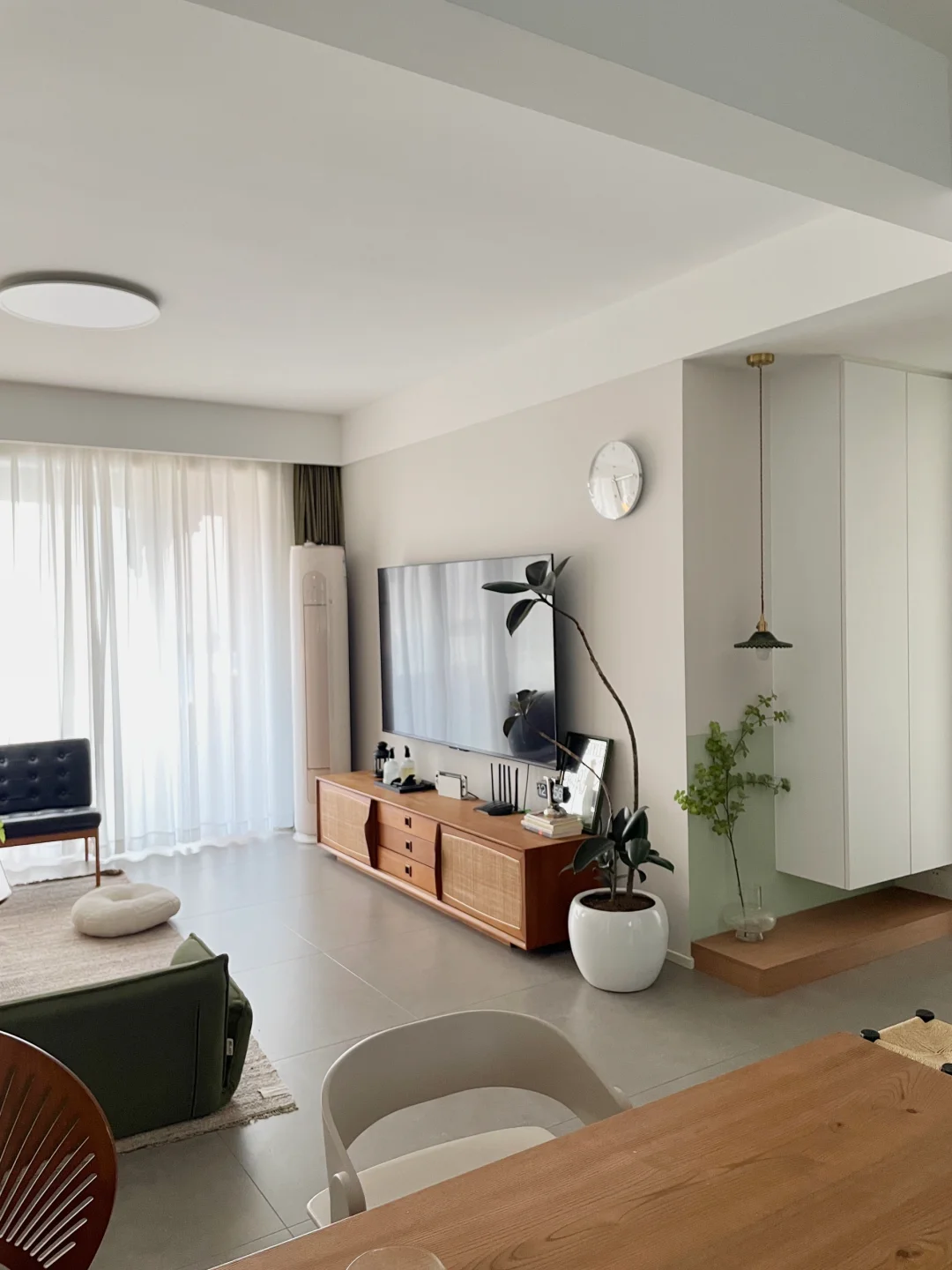 由于铺了冷色调瓷砖,家具搭配选择了自带温度感的胡桃木、樱桃木为主,还有一些藤编元素,可以中和下地砖的冰冷感,